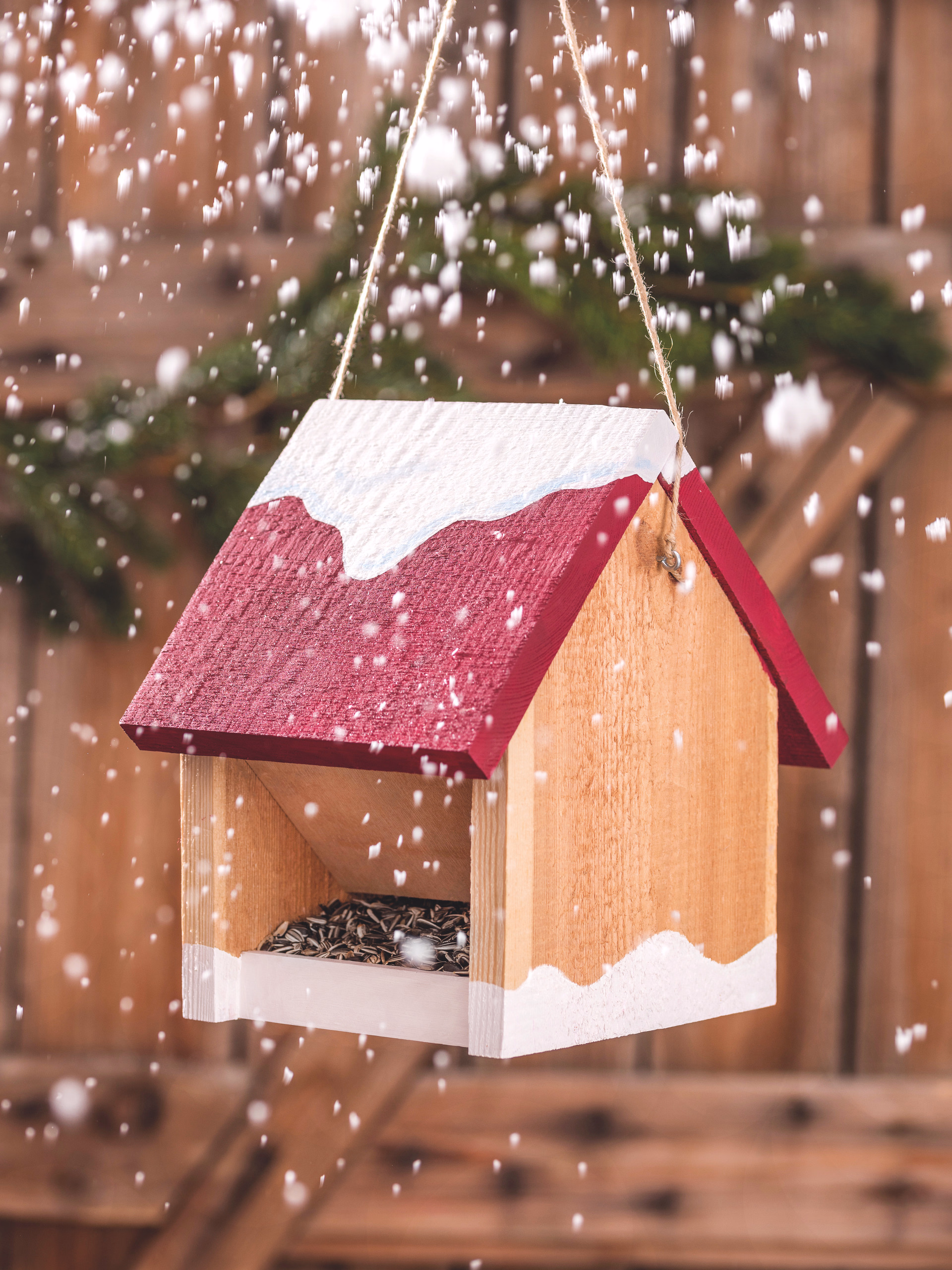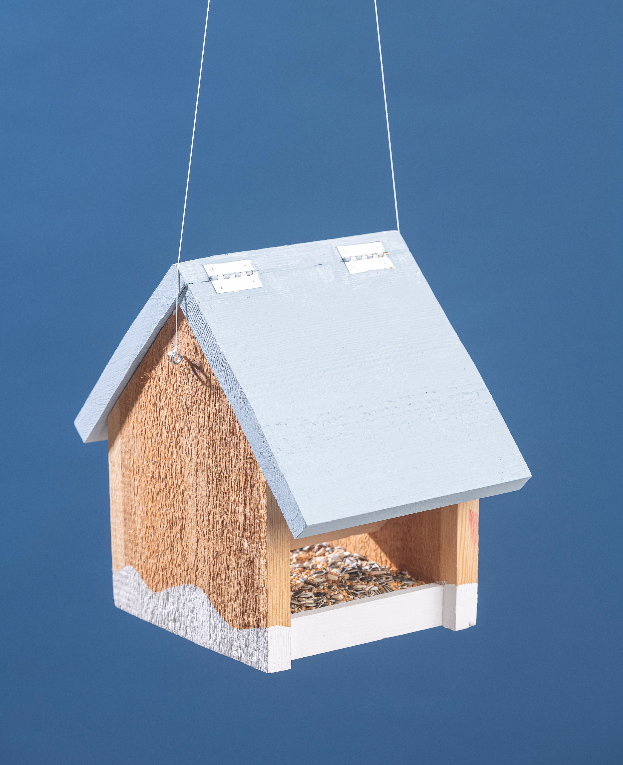 Vollholz-Futterhaus bestehend aus sägerauen und naturbelassenen PEFC zertifizierten Holzzuschnitten. Das Dach lässt sich auf einer Seite zum Befüllen des Futtersilos öffnen. Zwei Ösen zum Aufhängen an den Seiten. Erforderliche Arbeiten: Sägen, Feilen/Schleifen, Leimen und Montieren. Maße: ca. 195 x 230 x 290 mm, 1 Stück