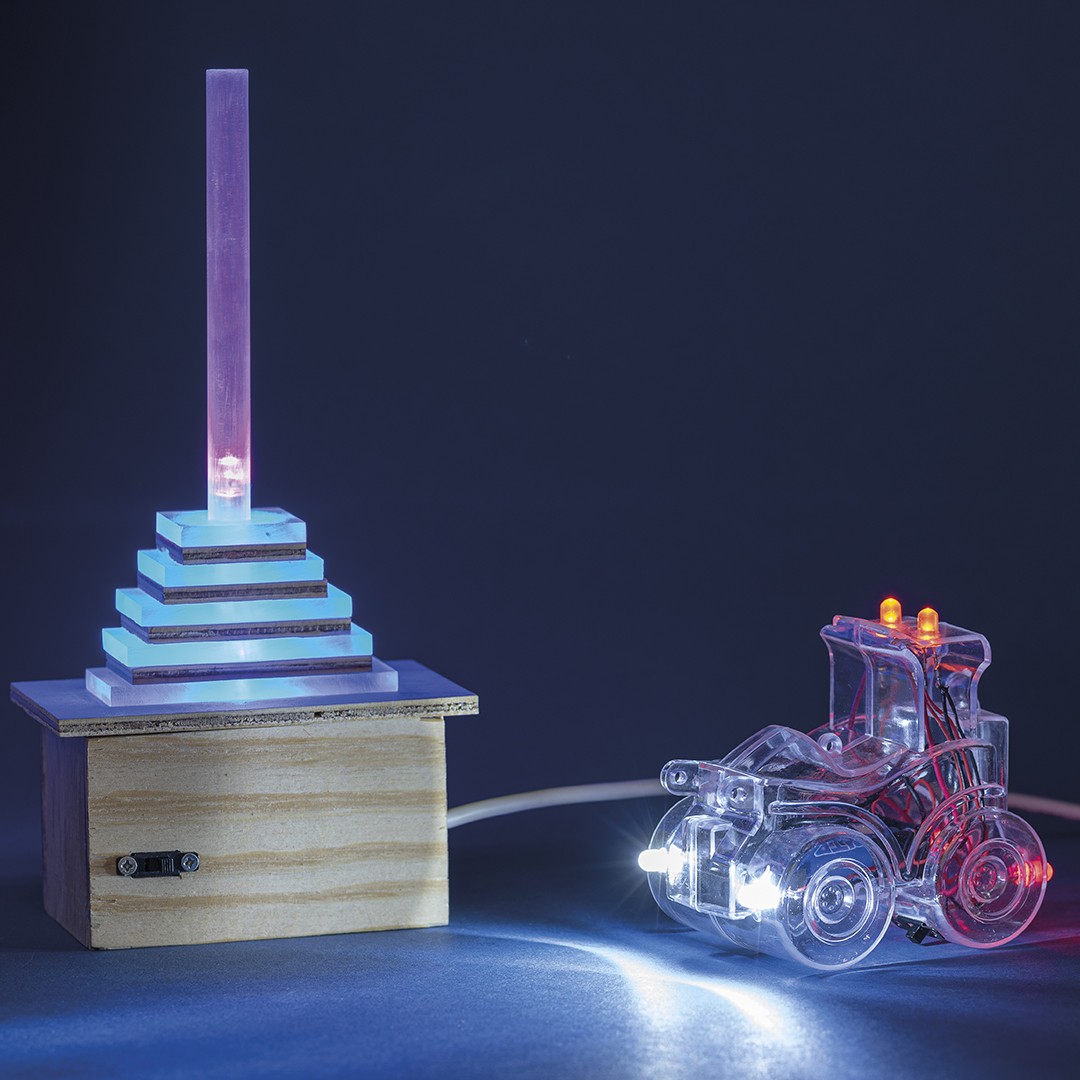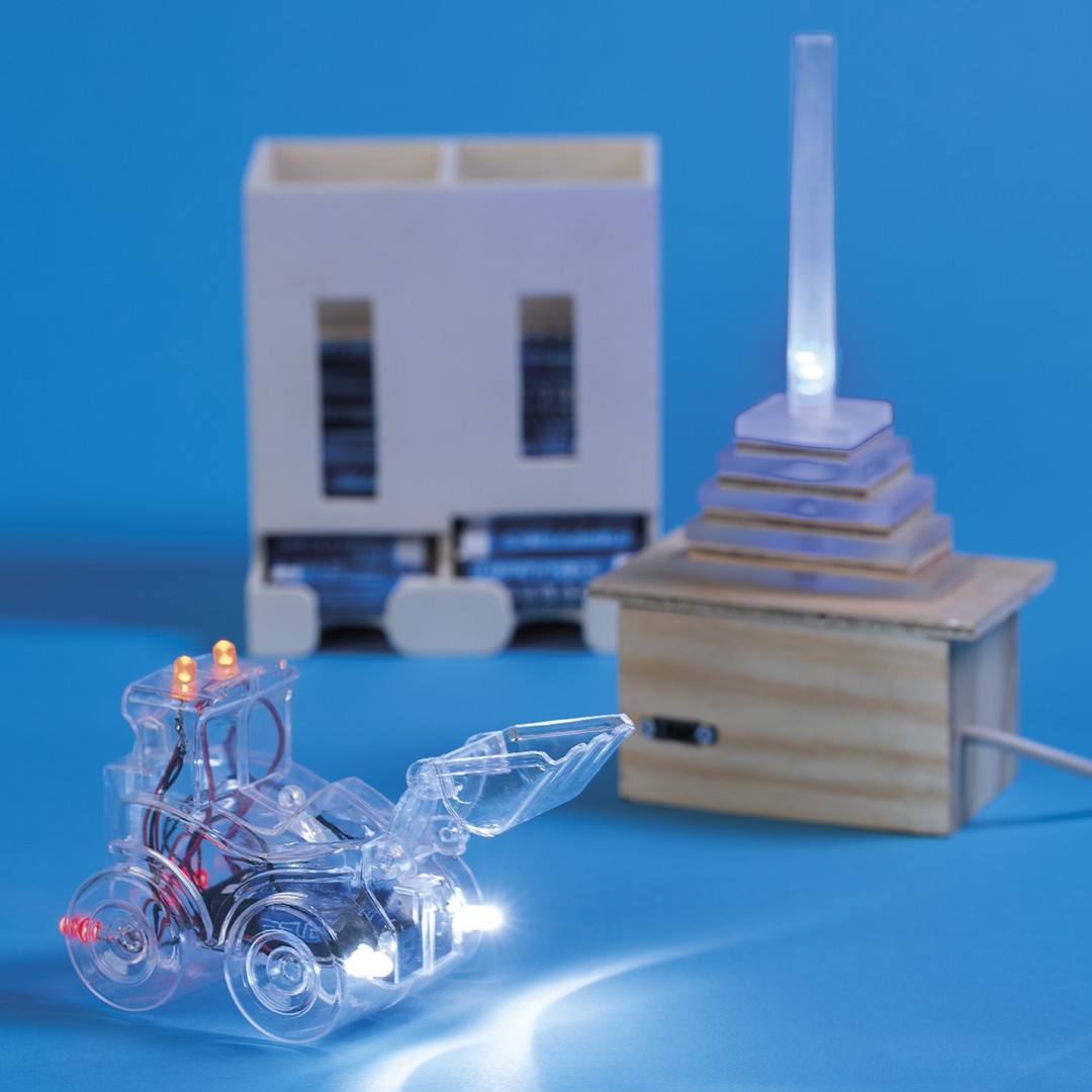 Die Gummimotor-Rakete mit Startrampe macht Aerodynamik sichtbar: gespannte Gummistränge, Energieübertragung, Flugverhalten – ein Schulprojekt mit Lerneffekt und echtem Aha-Moment. Der Acryl-Traktor mit LED-Beleuchtung, das LED-Nachtlicht Skyline sowie die Mini-Metallbausätze führen praxisnah in die Welt der Technik ein – wahlweise mit Löten oder einfachen Steck- und Schraubverbindungen. Dabei trainieren Kinder Motorik, räumliches Denken und grundlegendes technisches Verständnis. Alle Metallbausätze sind kompatibel und erweiterbar, das passende Werkzeug liegt bei.