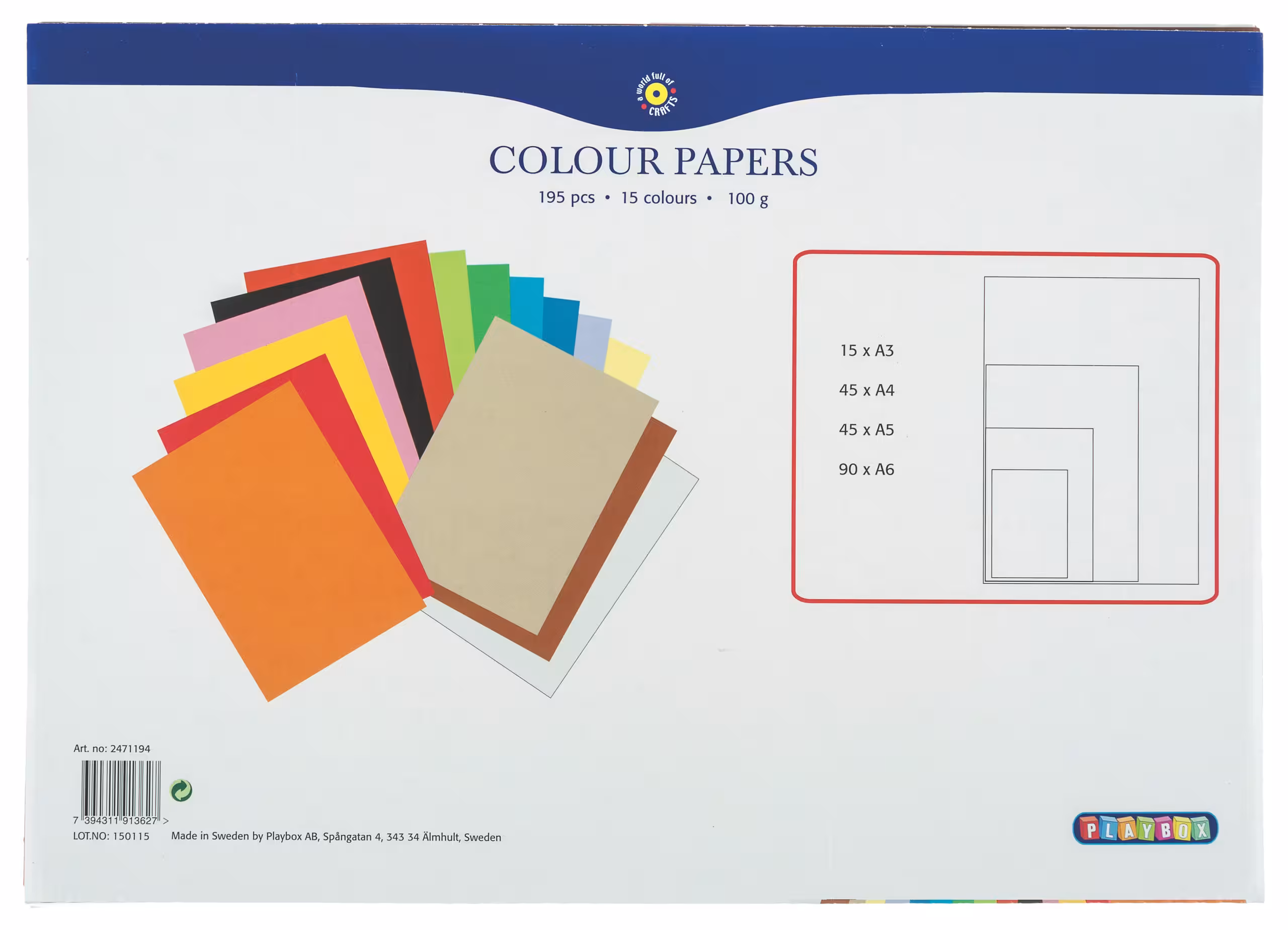 100 g/qm Papier, 15-farbig sortiert, Formate: 90 x DIN A6, 45 x A5, 45 x A4 und 15 x A3, 195 Blatt