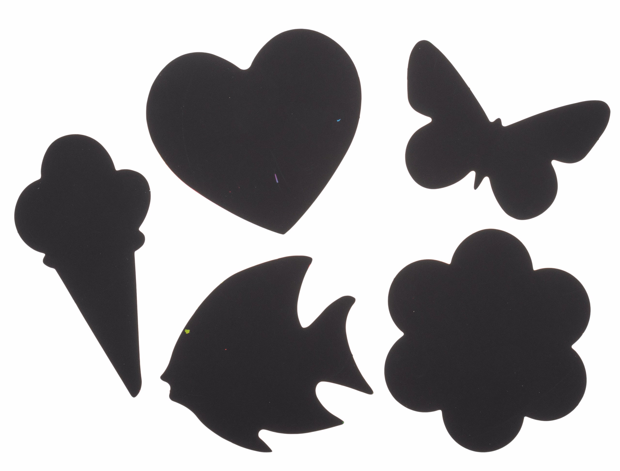 25 Kratzpapiere, verschiedene Motive (je 5x Schmetterling, Eistüte, Herz, Blume, Fisch), Regenbogen-Kratzpapier mit schwarzer Beschichtung, Maße: ca. 60 - 95 mm, 25 selbstklebende Magnetstreifen, 25 Kratzstäbchen aus Kunststoff, 25er-Set
