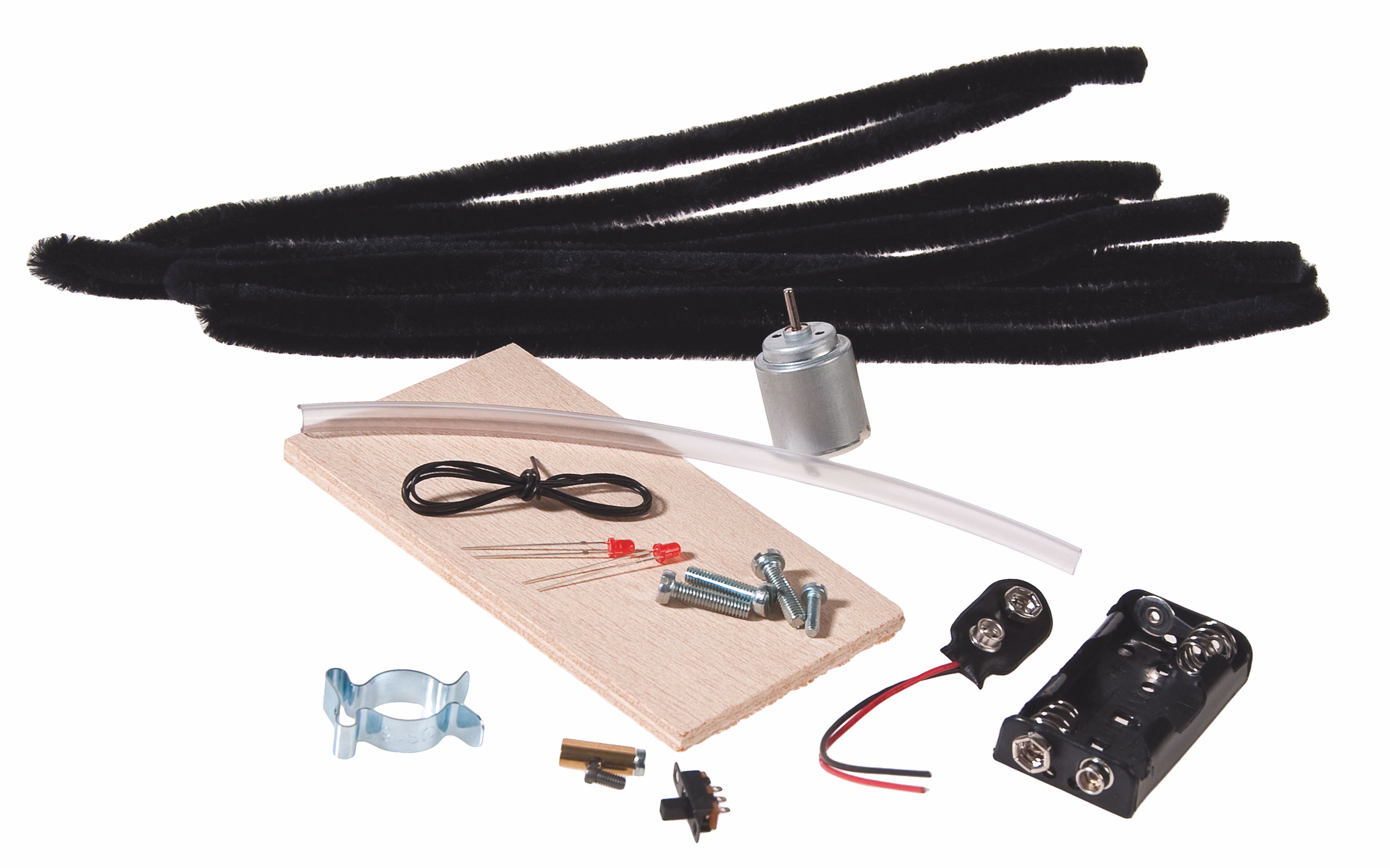 Bausatz ähnelt einer echten Spinne. Durch die Wackelbewegung, verursacht durch einen Elektromotor, der eine Unwucht erzeugt und diese auf die Füße überträgt, wird unser Modell zum Leben erweckt. Die LED-Augen unterstützen diesen Effekt. Der Aufbau ist sehr einfach auf einer Sperrholzplatte und der Stromkreis ist ohne Löten herzustellen.