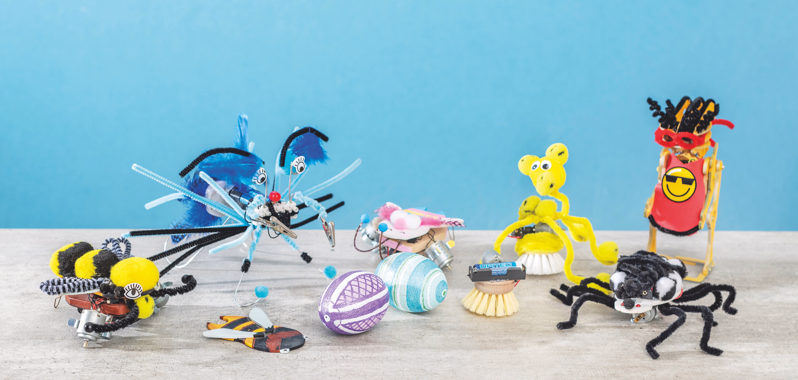 Bausatz ähnelt einer echten Spinne. Durch die Wackelbewegung, verursacht durch einen Elektromotor, der eine Unwucht erzeugt und diese auf die ...