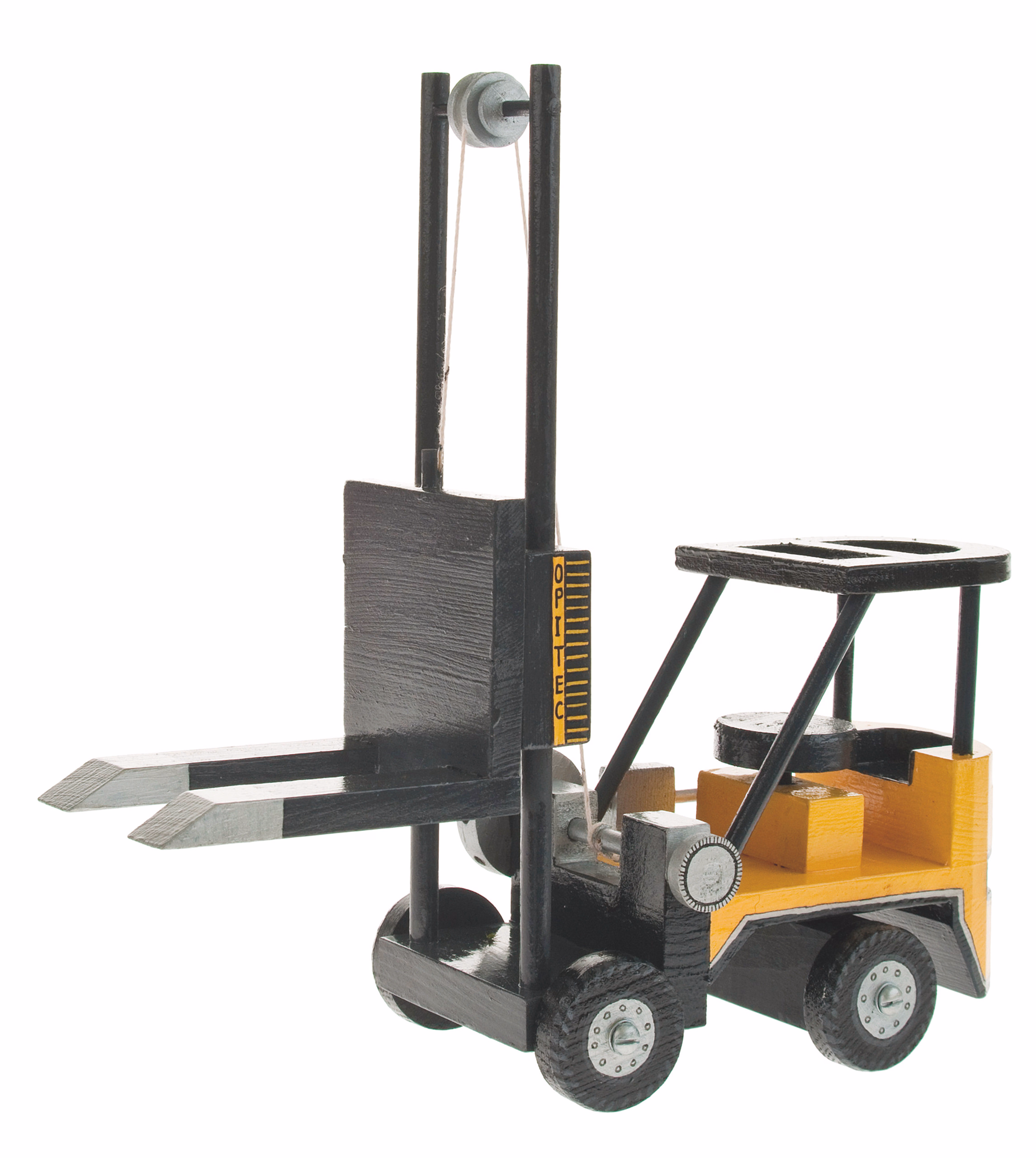 Die Gabel kann über eine Handkurbel mit Arretierung in jede Höhe bewegt und fixiert werden. Mit Drehschemellenkung. Zu den Bauteilen wird ein Plan mit vielen Detailzeichnungen geliefert. Lieferung ohne Dekoration. Erforderliche Arbeiten: Bohren, Sägen und LEimen. Maße: ca. 270 x 100 x 270 mm, Hubhöhe ca. 200 mm, 1 Stück