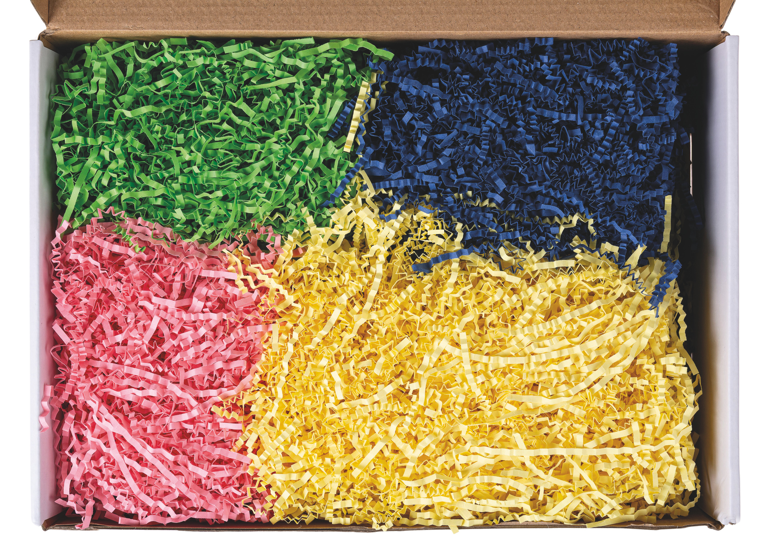 geschredderte Papierstreifen mit markanter Faltenstruktur, ideal zum plastischen Gestalten. Einfach in Modelliermasse drücken und formen, auf Papier, Holz, Styropor und Filz kleben. Für plastische Collagen und Oberflächenstrukturen, 4 x 50g, pink, gelb, grün, blau