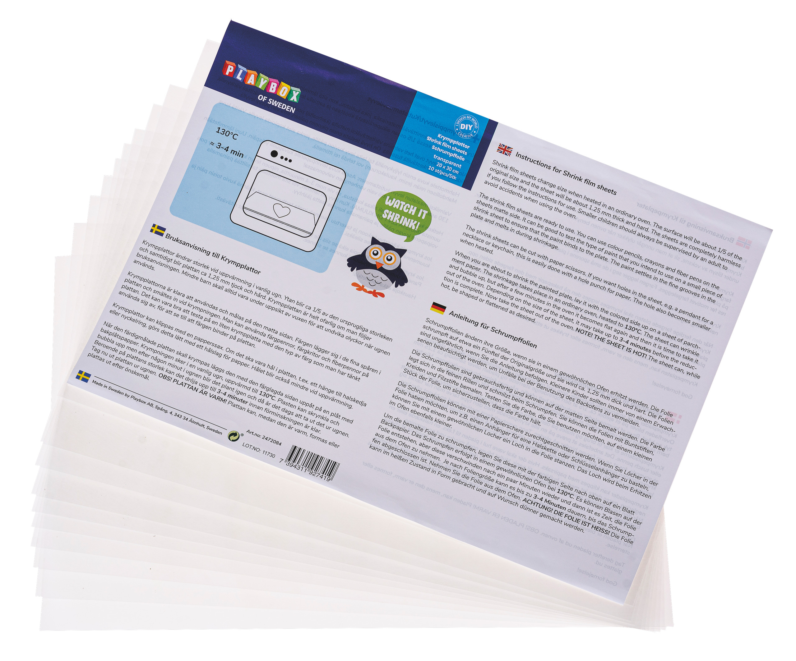 Schrumpffolien ändern ihre Größe um etwa ein Fünftel und werden ca. 1,25 mm stark, wenn sie im Backofen auf 130°C erhitzt werden. Die matte Seite kann mit Buntstifte, Filzstifte und Kreiden bemalt werden, bitte Tests vorher durchführen. Vor dem Brennen mit einer Schere zurechtschneiden. Maße: ca. 20 x 30 mm, transparent, 10 Stück, inkl. Anleitung