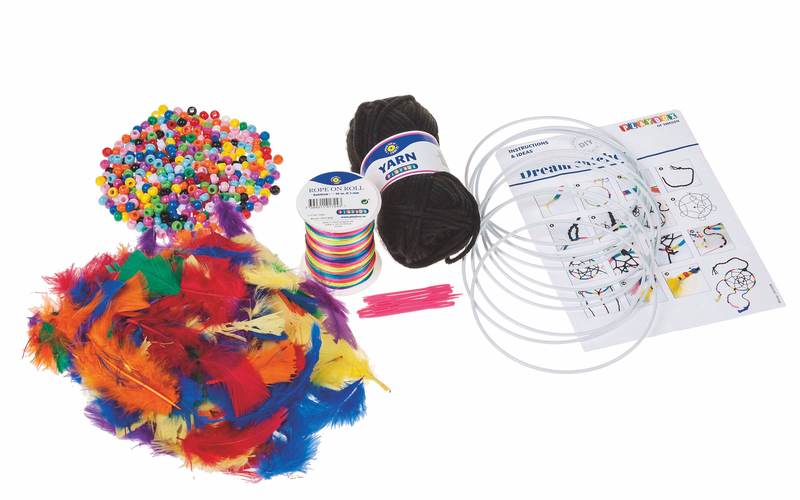 Inhalt: 10 Metallringe ca. ø 150 mm, 10 Kunststoff-Nadeln, Wolle, Regenbogen-Kordel, Perlen und Federn...