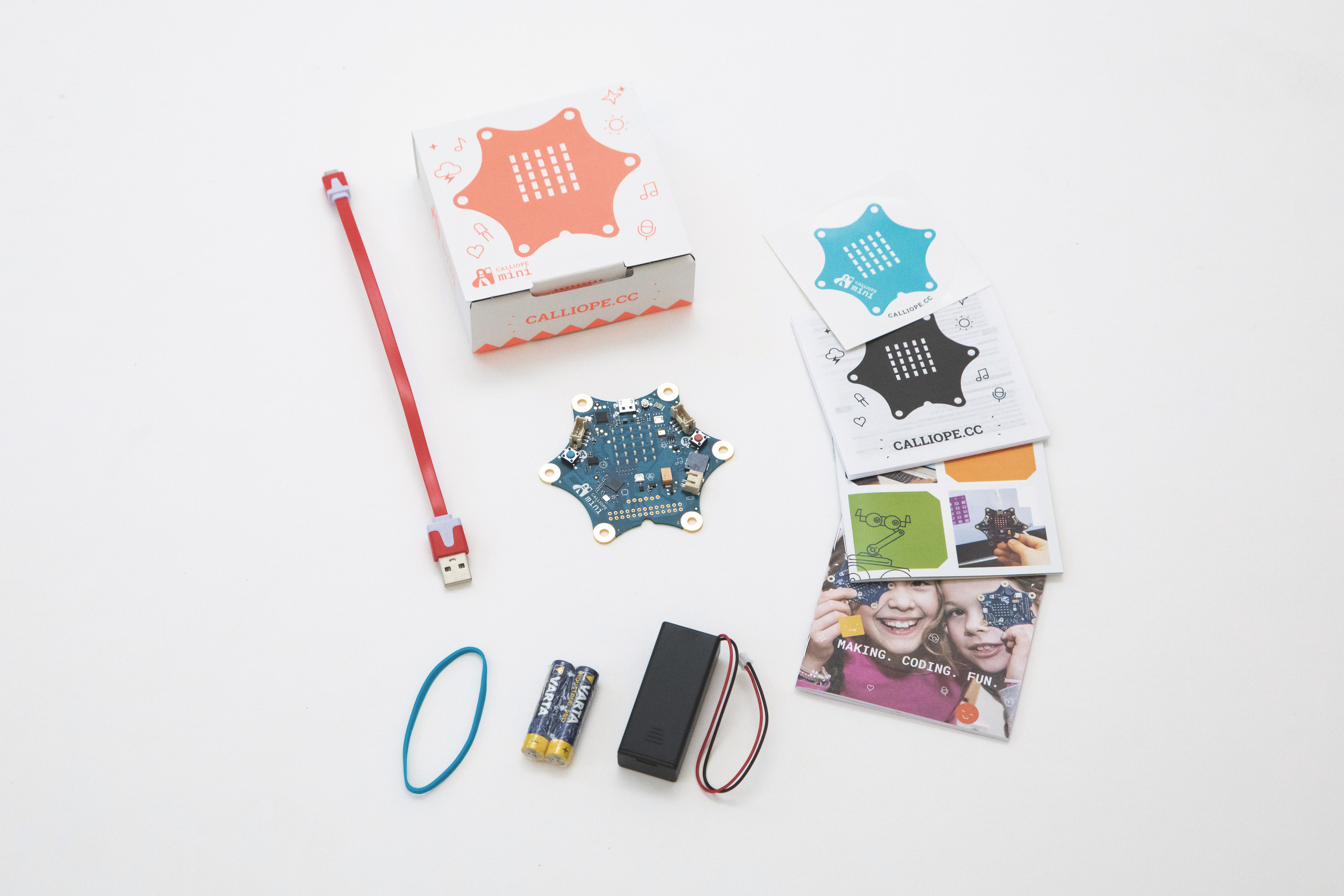 Inhalt: Calliope mini V3, Batteriehalter mit Batterien (2 Micro AAA), USB-C-Kabel, Aufkleber, Anleitung mit Programmierbeispielen in Deutsch und Englisch, 1 Set
