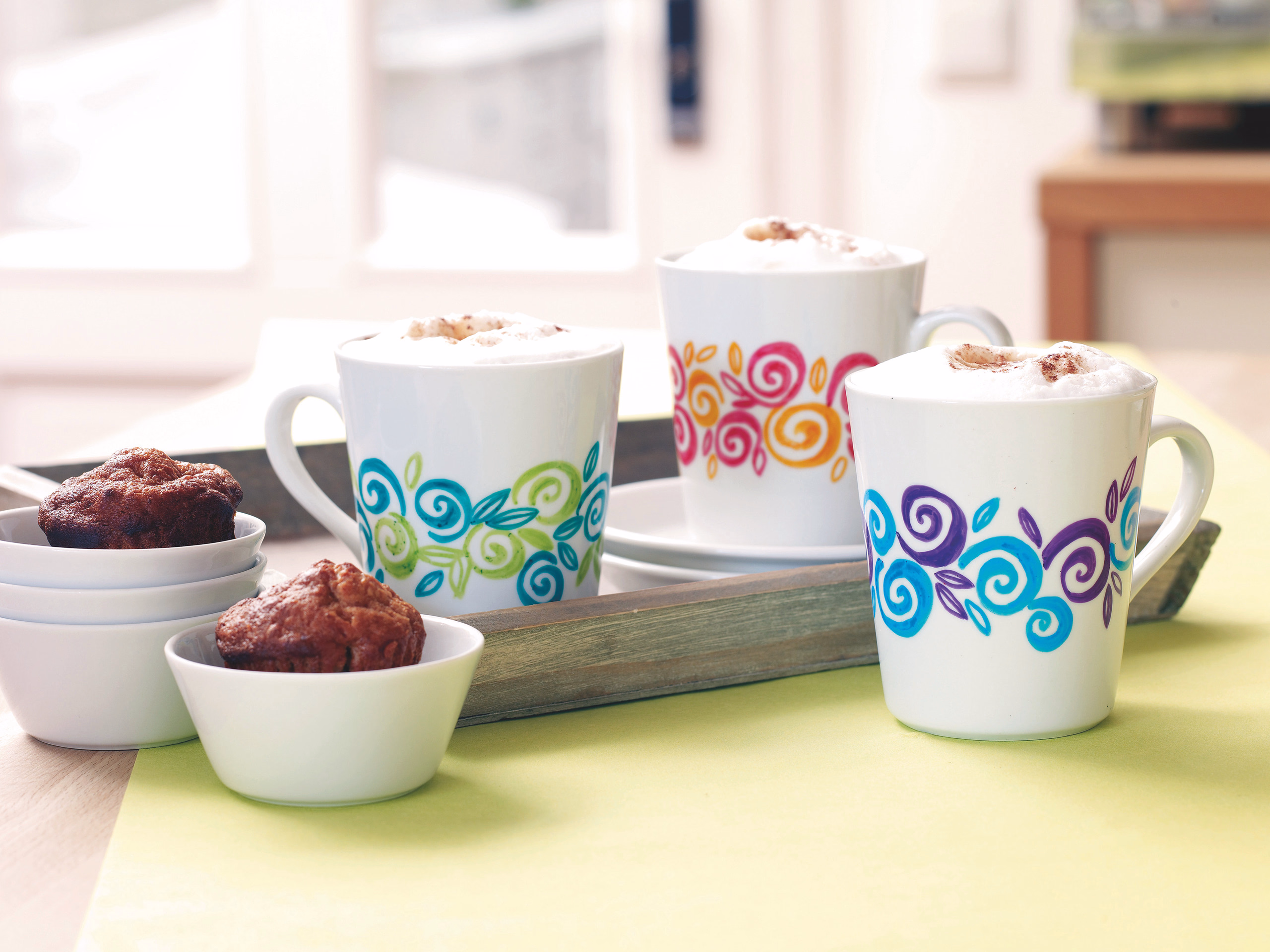 Fasermaler für Porzellan, glasierte Keramik, ofenfestes Glas, in den Farben rot, orange, braun, pink, hell- und dunkelrot. Nach dem Einbrennen spülmaschinenfest. Flexible Pinselspitze, cremiger Auftrag, gleichmäßiges Farbergebnis, kein Verlaufen und lichtbeständige Pigmenttinte auf Wasserbasis. Schnelltrocknend und vor dem Einbrennen korrigierbar.
