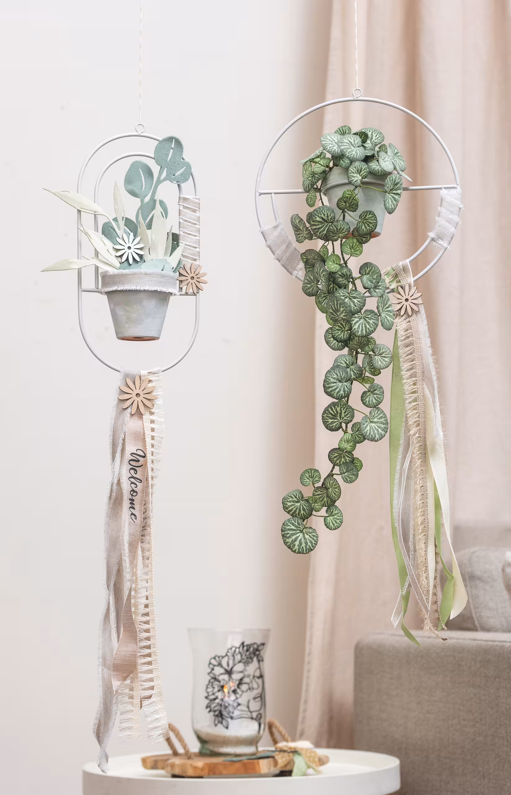 zum Hängen, ovale Form, sandfarben beschichtet, ohne Dekoration, Maße: ca. 150 x 82 x 300 mm, Topfhalterung: ca. ø 82 mm, 1 Stück
