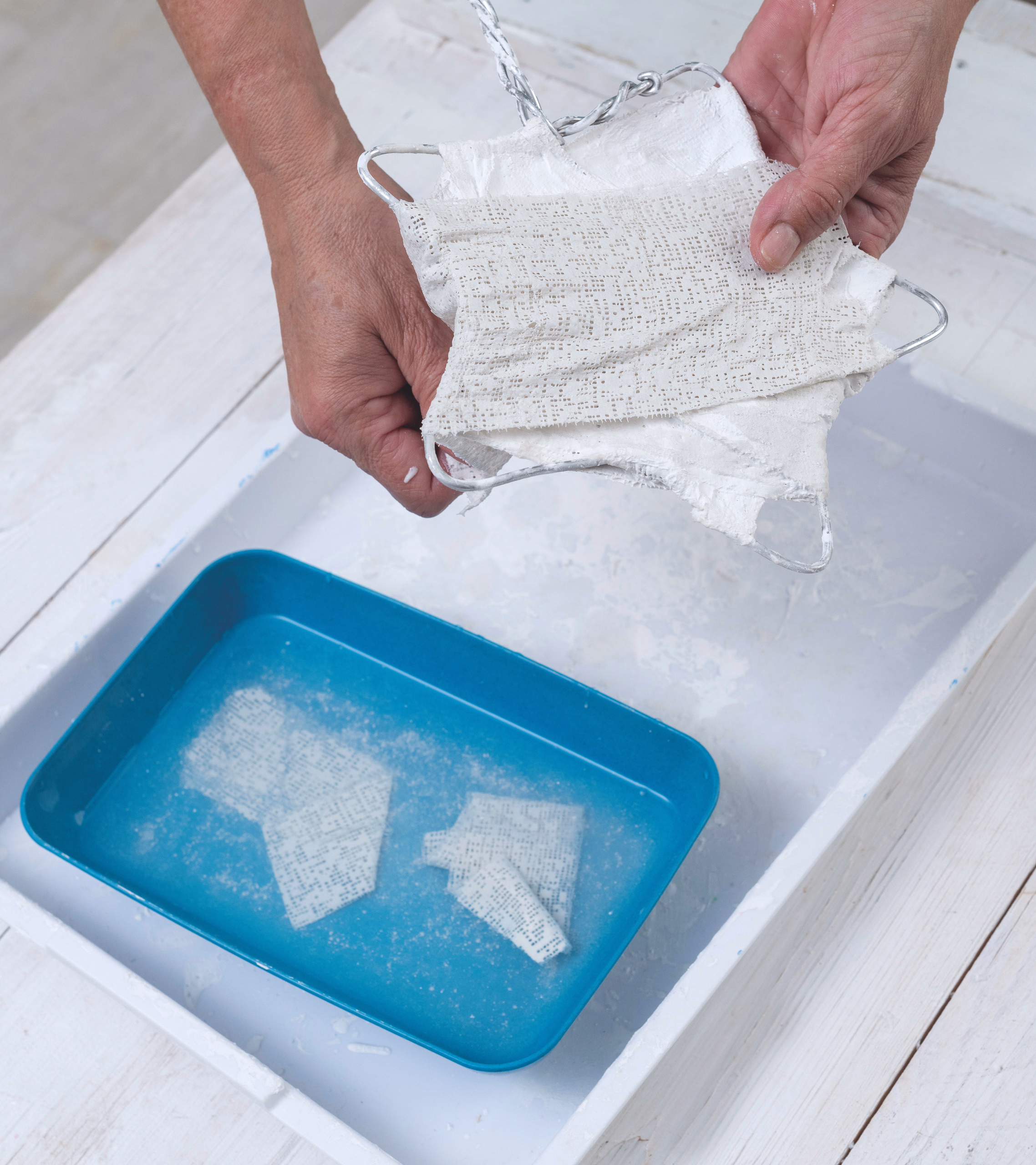 Das Modelliergewebe ist mit hochwertigem Gips angereichert und eignet sich durch seine Eigenschaften hervorragend für Collagen, Abformungen und Modellieren von Modell-Landschaften. Die Handhabung ist äußerst einfach. Mit einer Haushaltsschere schneidet man je nach Bedarf verschieden lange und breite Streifen und taucht diese in ein mit Wasser gefülltes Gefäß. Das nasse Gewebe kann nun in die gewünschte Form gebracht werden und ist nach wenigen Minuten hart. Es können auf diese Art auch mehrere Lagen nass in nass angebracht werden. Die fertige Arbeit kann nun bemalt und anschließend mit Seidenmattlack verschlossen werden.