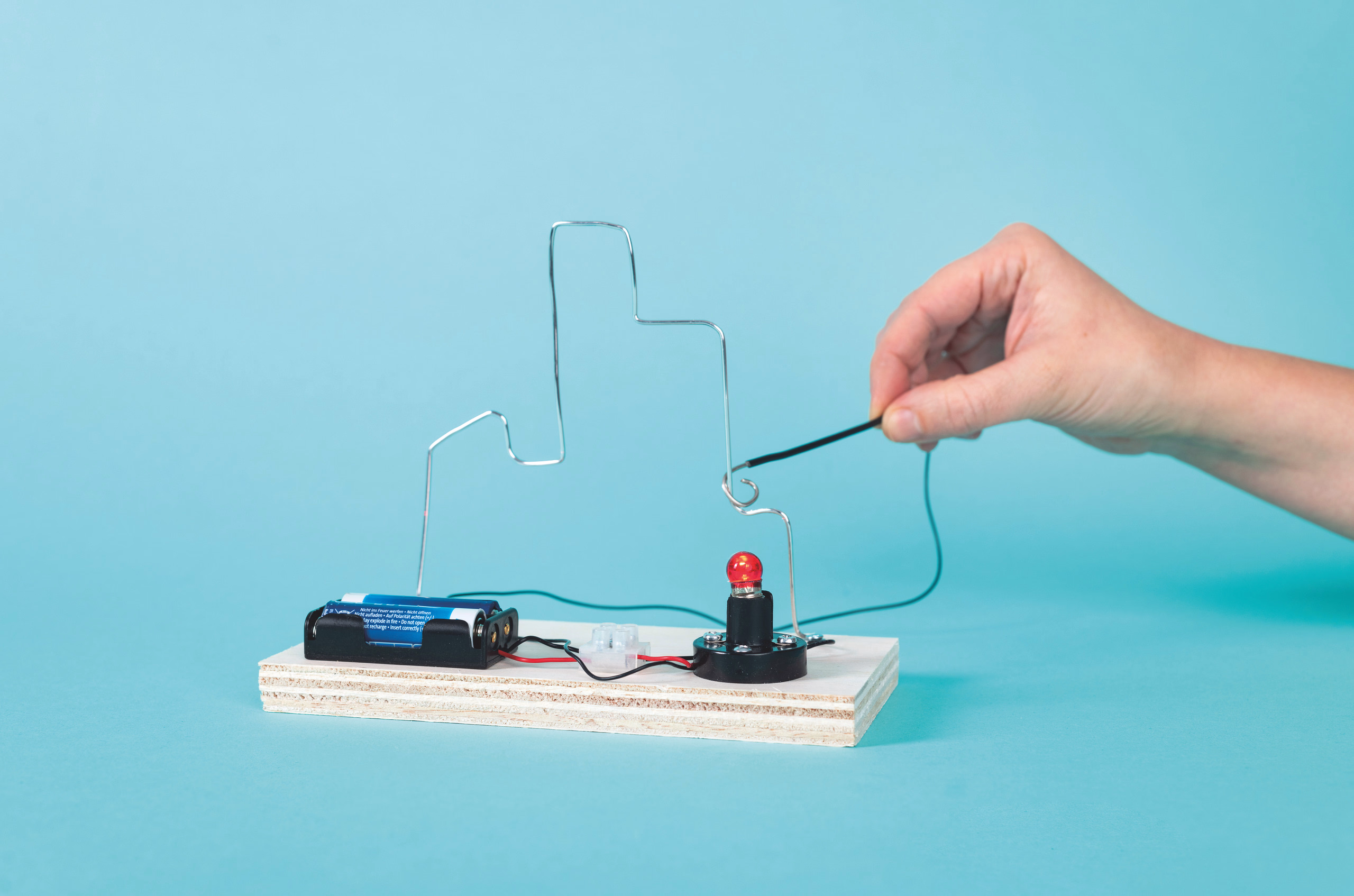 Ein bekanntes Geschicklichkeitsspiel. Beim Berühren des Drahtes leuchtet ein rotes Licht auf. Einfacher Stromkreis ohn...