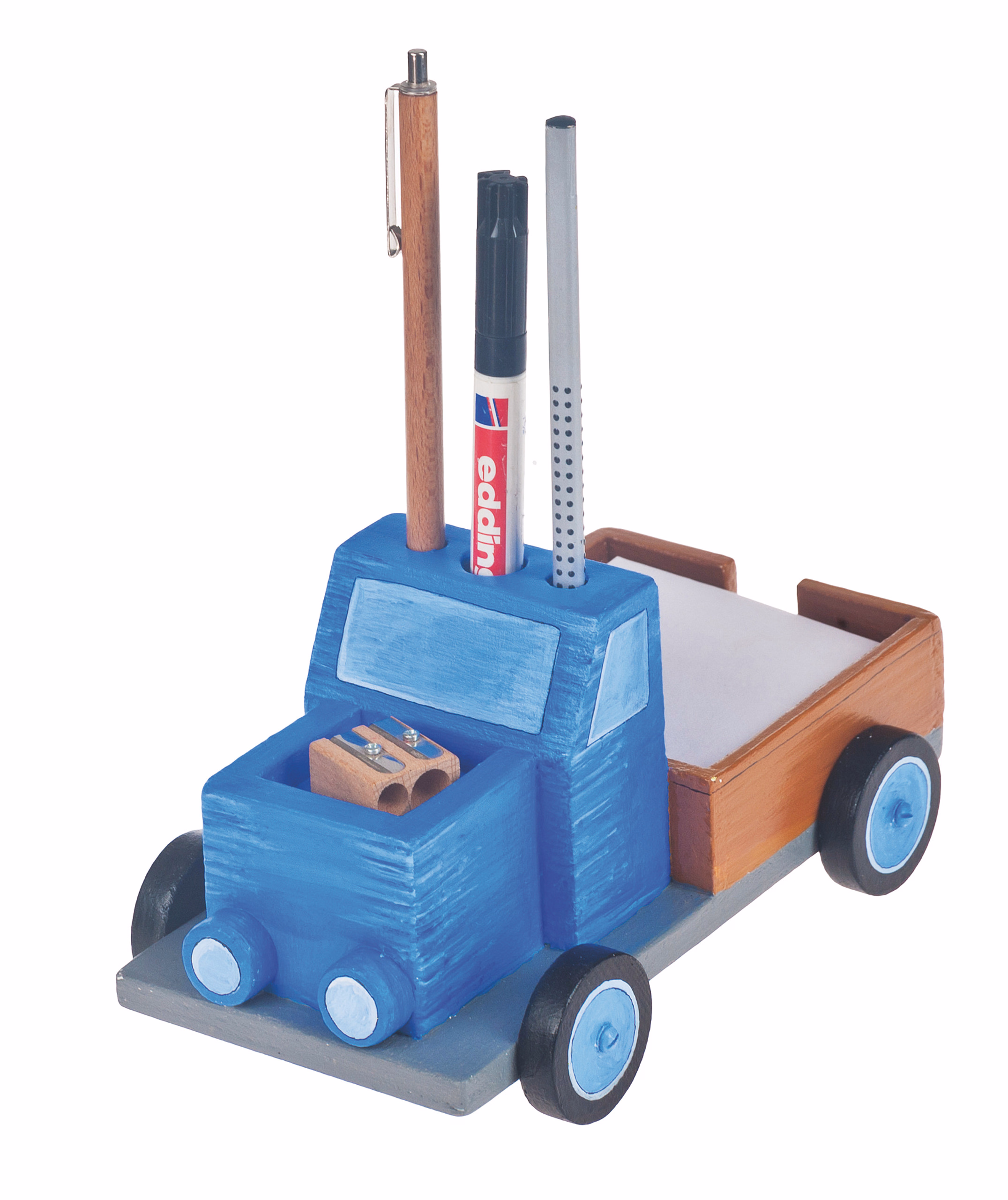 Mit diesem Bausatz lässt sich mit einfachen Mitteln ein funktionales und formschönes Schreibtisch-Set in Form eines LKWs herstellen. Für die individuelle Gestaltung des Fahrzeugs bleibt viel Freiraum, so dass auch eigene Ideen verwirklicht werden können. Lieferung ohne Dekoration und Notizblock. Erforderliche Arbeiten: Bohren, Sägen, Leimen und Montieren.