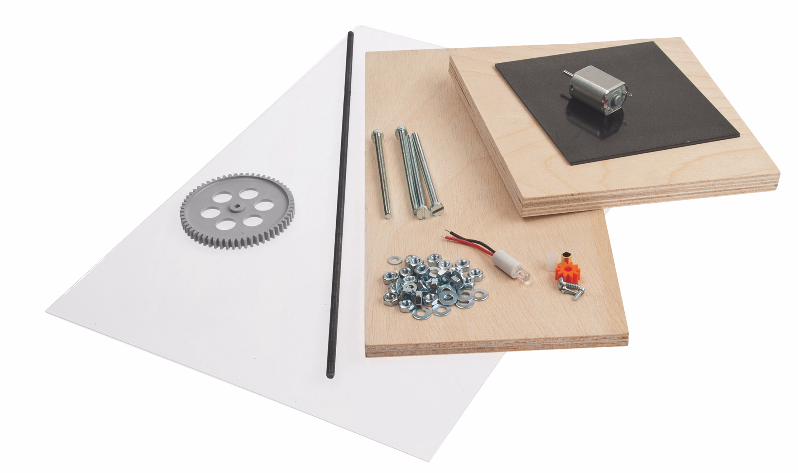 Funktionsmodell eines Windgenerators mit LED. Der Savonius-Rotor treibt ein Zahnrad an, welches wiederum einen Motor als Generator antreibt und so eine Niedervolt-LED zum Leuchten bringt. Erforderliche Arbeiten: Anreißen, Bohren, Sägen, Schleifen, Kleben, Montieren und evtl. Löten.