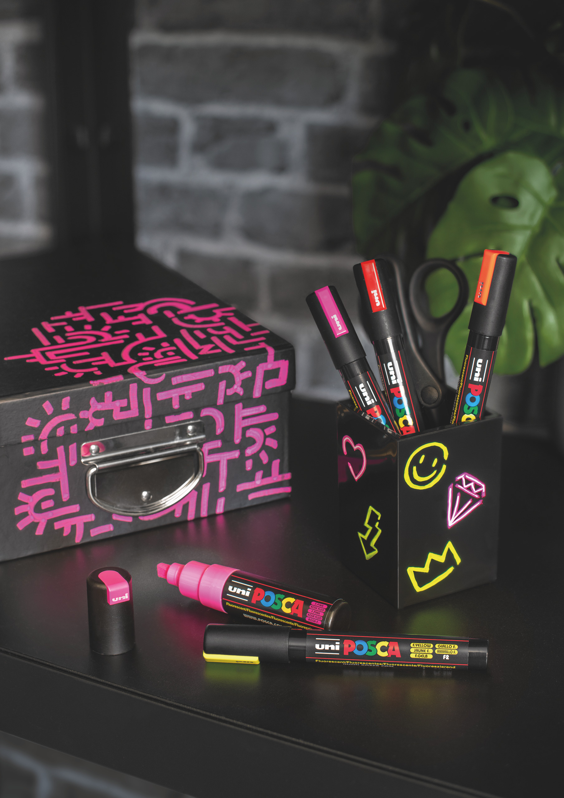 Die Farbmarker sind auf Wasserbasis und für alle Oberflächen geeignet. Das bedeutet, man kann die POSCA Marker auf Papier, Karton, Terrakotta, Kunststoff, Metall, Textilien, Holz, Keramik, Porzellan und Glas anwenden. Die Farben sind opak, deckend und trocknen schnell.