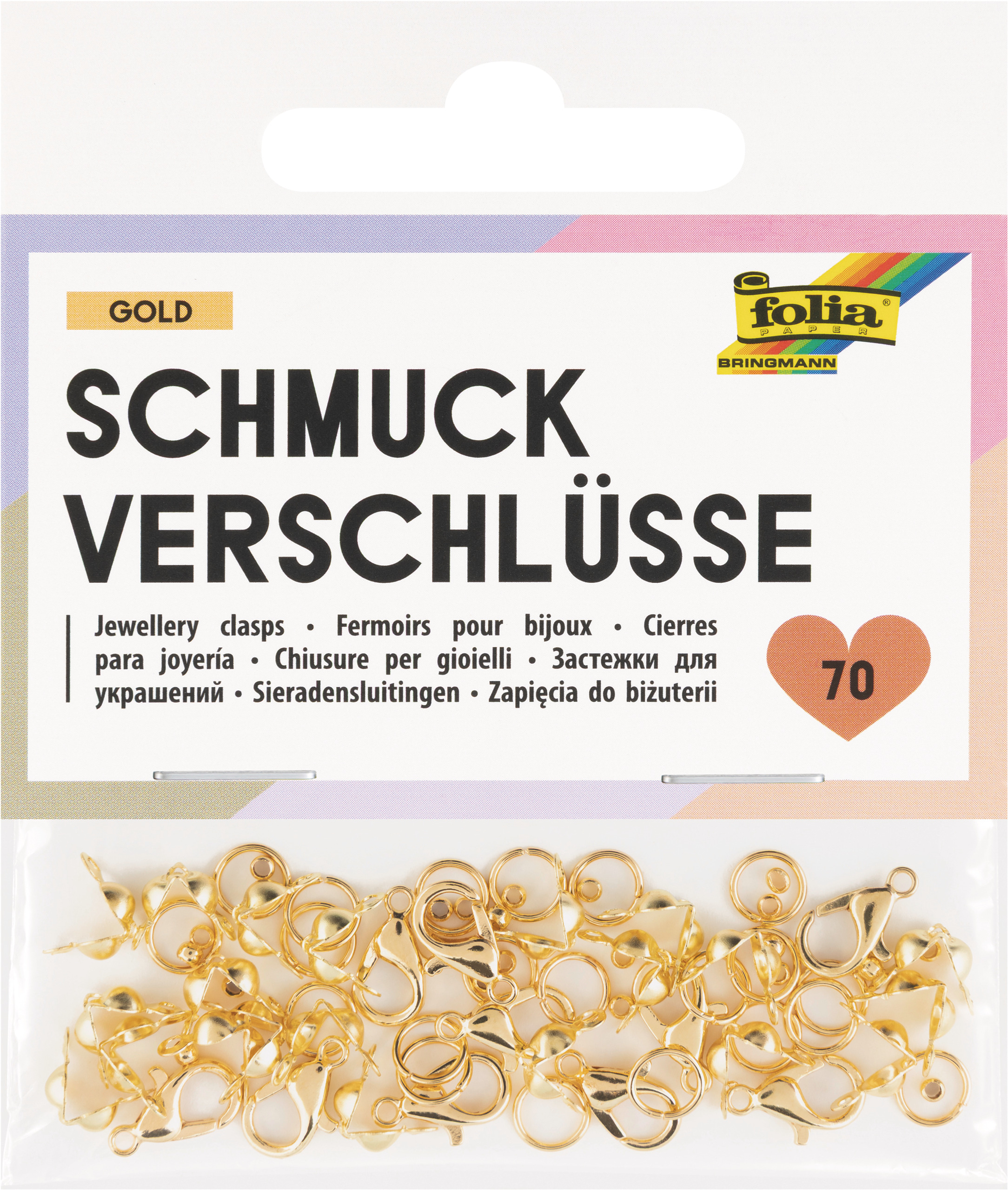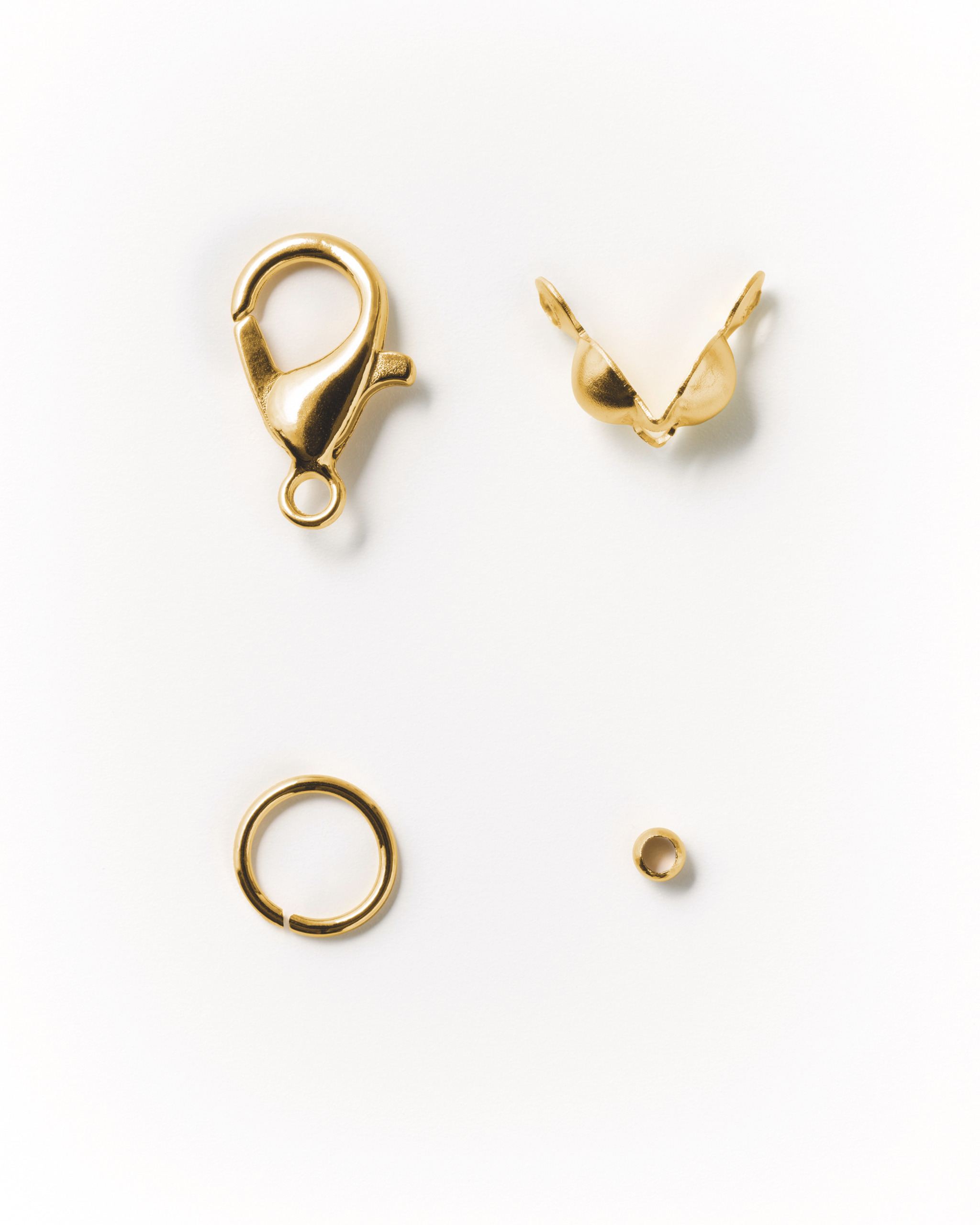 Inhalt: 10 x Karabiner ca. 6 x 12 mm , 20 x Quetschkalotten ca. ø 4 x 7 mm, 20 x Zwischenringe ca. ø 6 mm, 20 x Quetschperlen ca. ø 1 mm, goldfarben, 70er-Set
