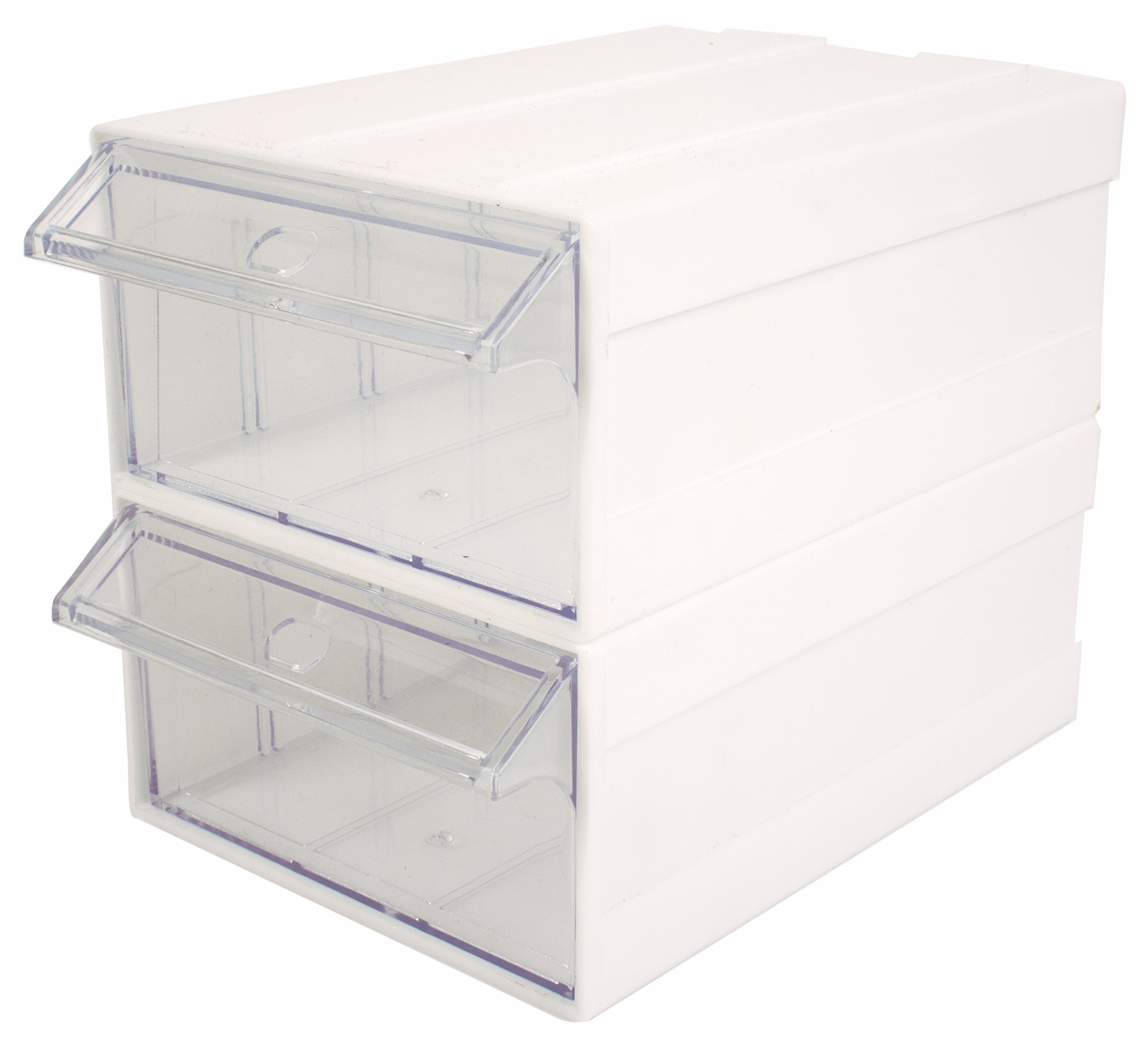 weiße Box mit 2 Schiebeboxen und Griff, mit 8 Trennstegen, 3 Papier-Beschriftungsstreifen und 3 Schutzstreifen, Maße: weiße Box ca. 185 x 135 x 155 mm, Schiebebox ca. 180 x 125 x 70 mm, 1 Stück