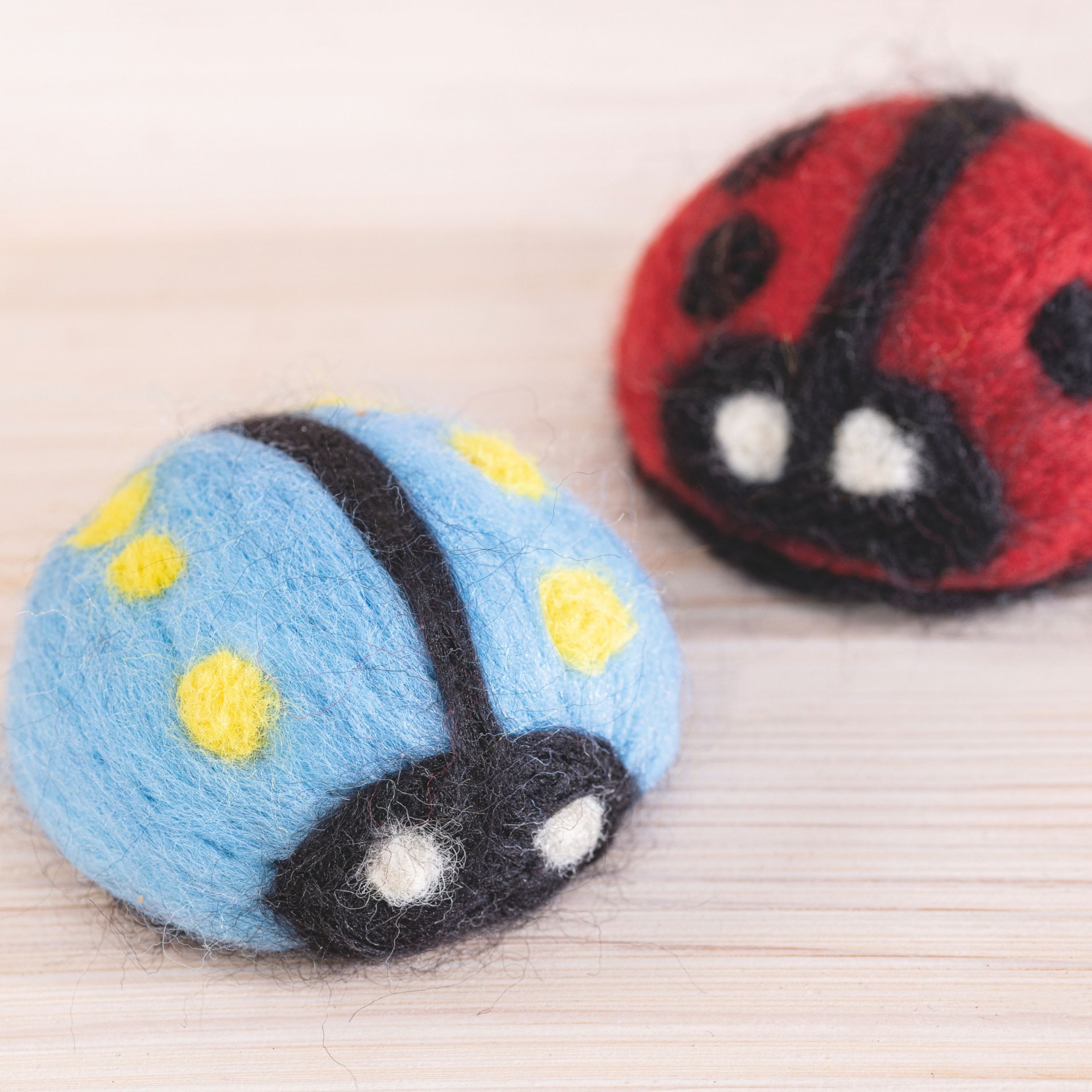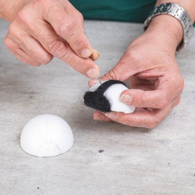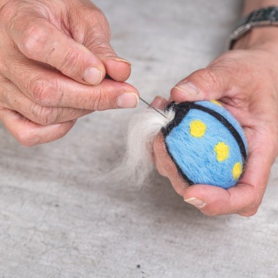 Für die rot-schwarze Käfervariante bleibt der Arbeitsablauf unverändert. Lediglich die obere Körperfläche sowie die Punkte werden mit andersfarbiger Schurwolle gestaltet.