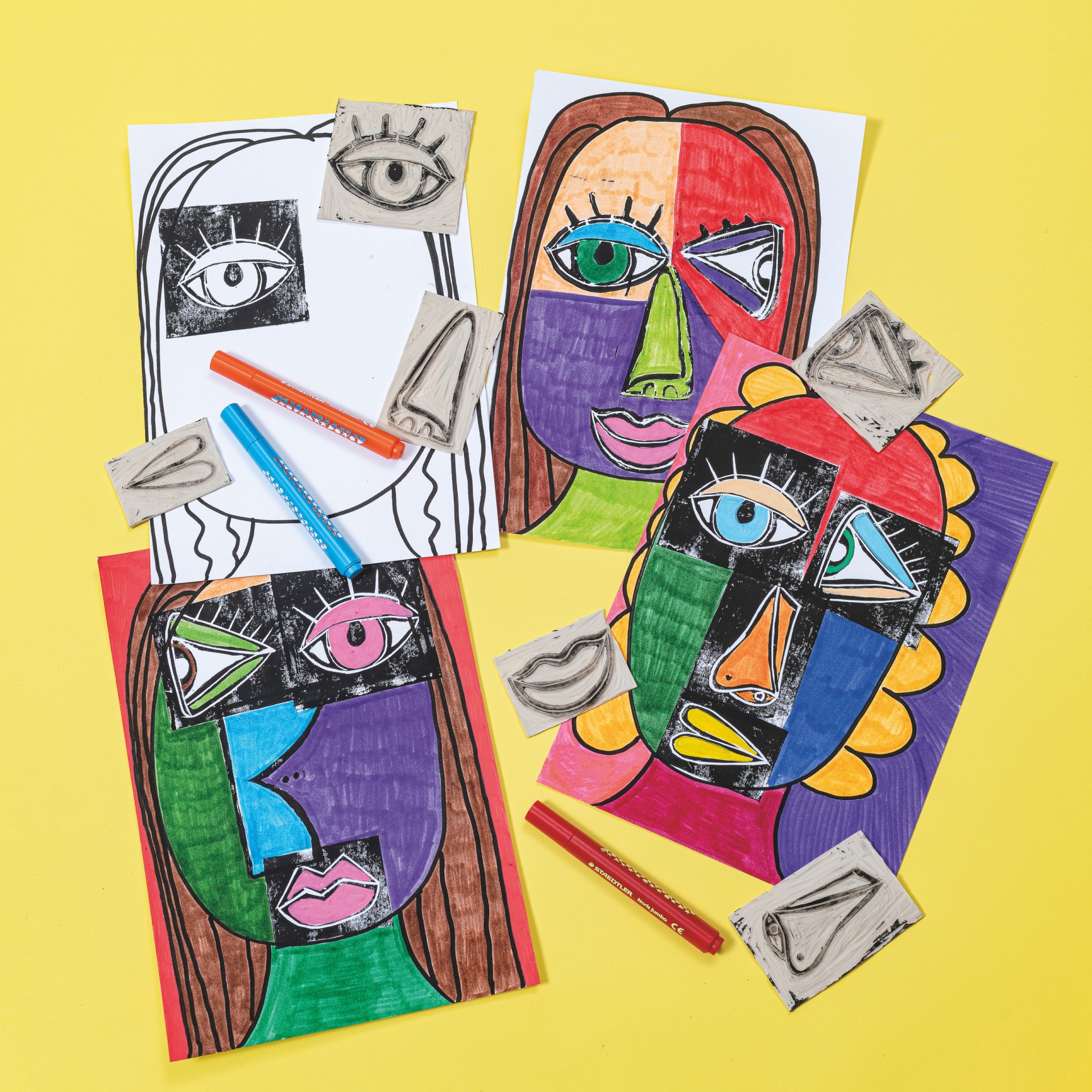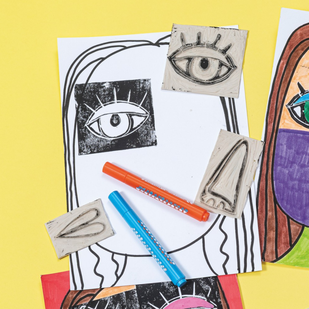 So verbinden die Kinder eine grafische Drucktechnik mit freier Farbgestaltung und entwickeln ein individuelles, kubistisch inspiriertes Porträt.
