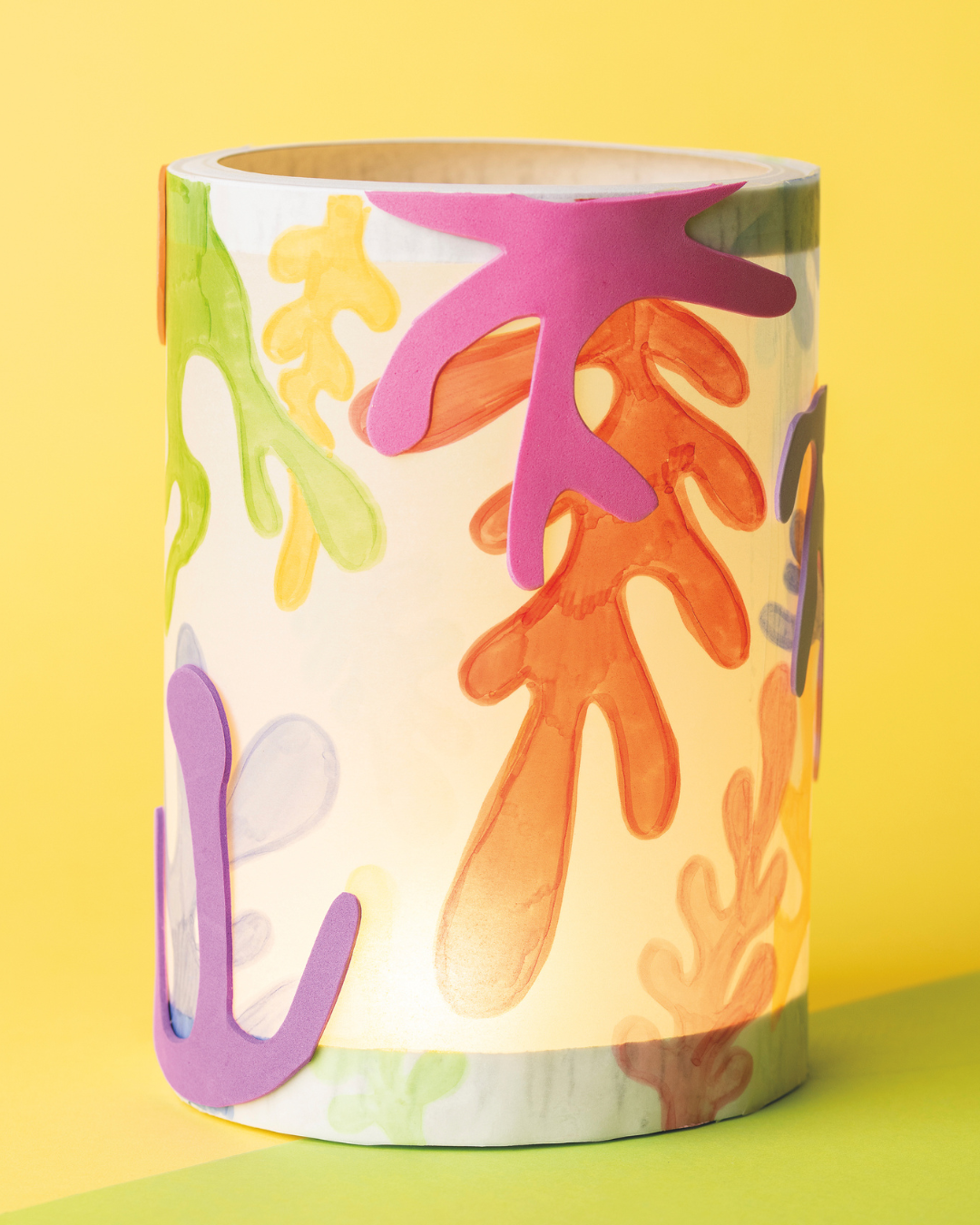 Fasermaler auf Transparentpapier erzeugen leuchtende, durchscheinende Farbflächen. Moosgummi hingegen ist lichtundurchlässig. Es setzt klare Kontraste und strukturiert die Komposition. Sobald das LED-Licht im Inneren brennt, verändern sich Intensität und Wirkung der Farben nocheinmal sichtbar.