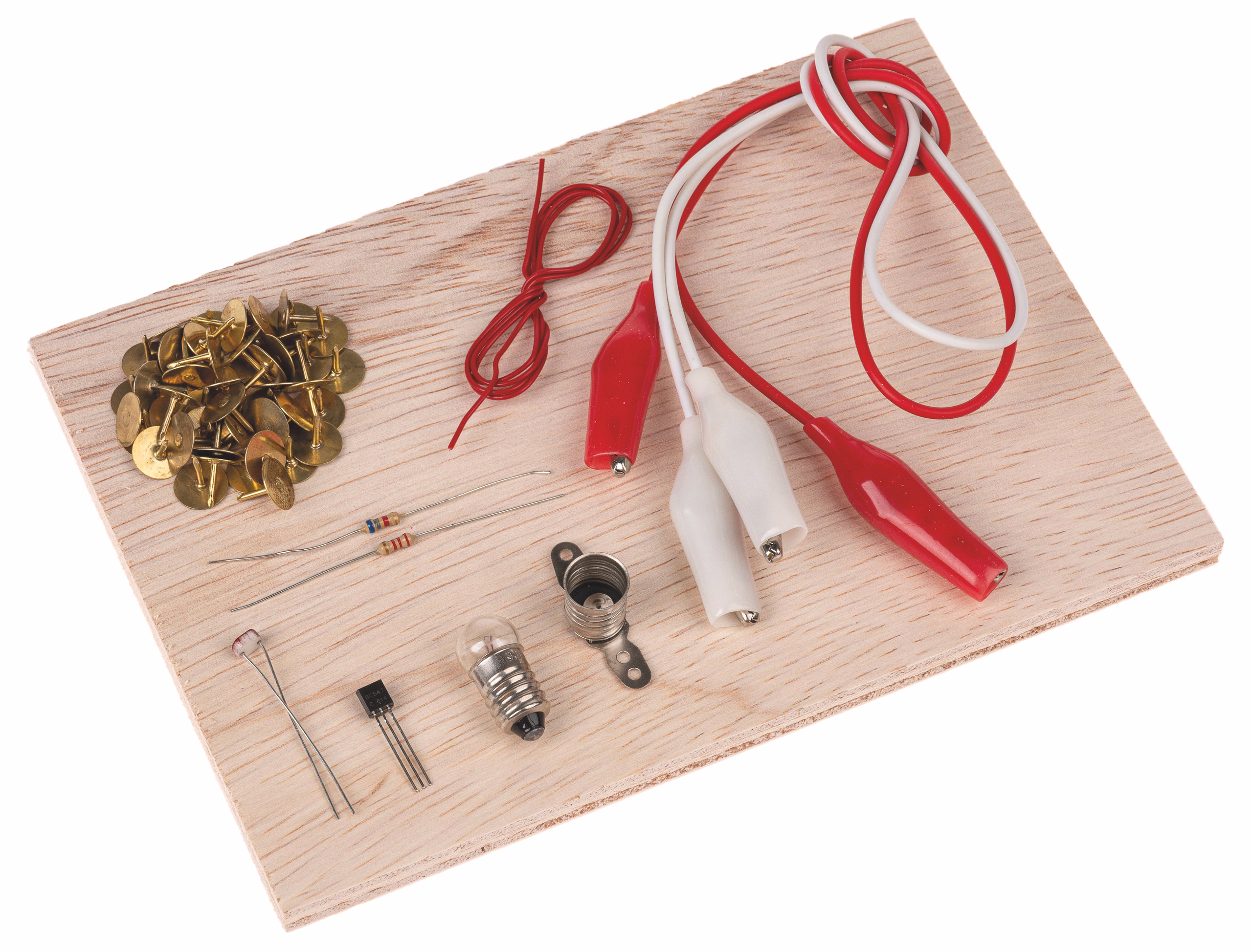 Lieferung ohne 4,5 V-Batterie, Grundplatte (Platine) und Reißnägel.