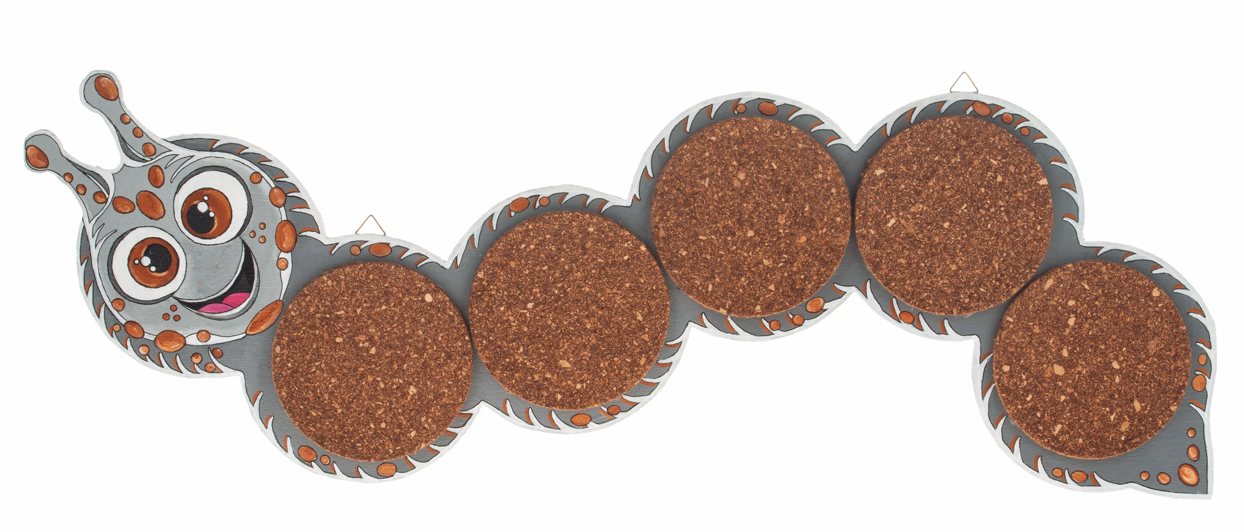 Einfach die Konturen der Raupe vom Bauplan auf die große Sperrholzplatte übertragen, aussägen und die Segmente nach Belieben bemalen. Abschließend die 6 großen Korkscheiben aufleimen und die Bildaufhänger befestigen.