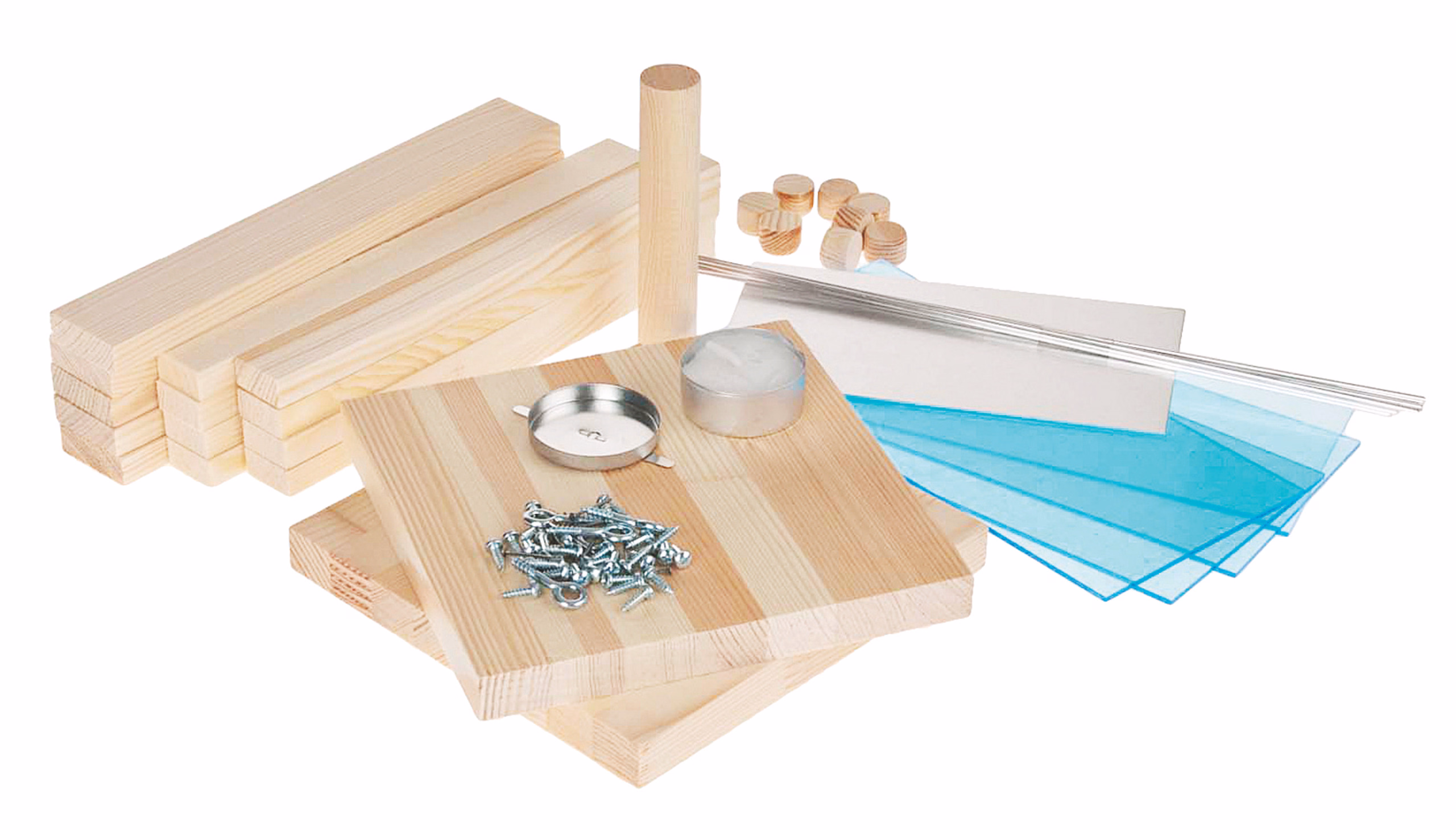 Dekoratives Werkstück aus massiver Kiefer, Acrylglas und Aluminium. Schneller Aufbau durch stumpfe Leimverbindungen.