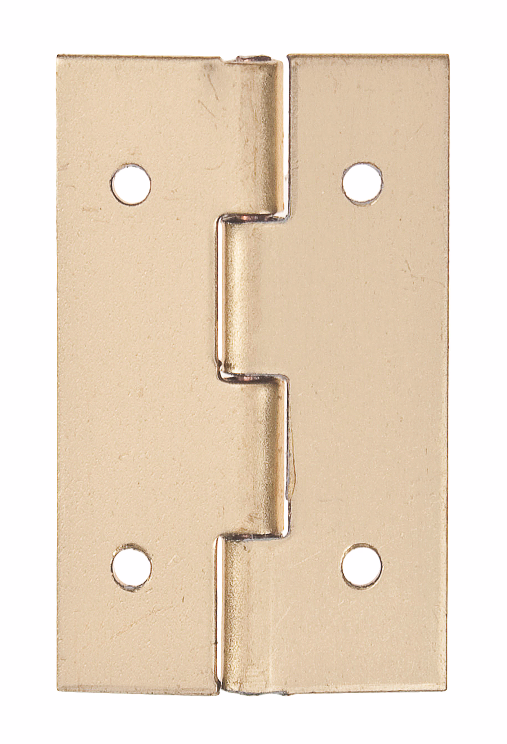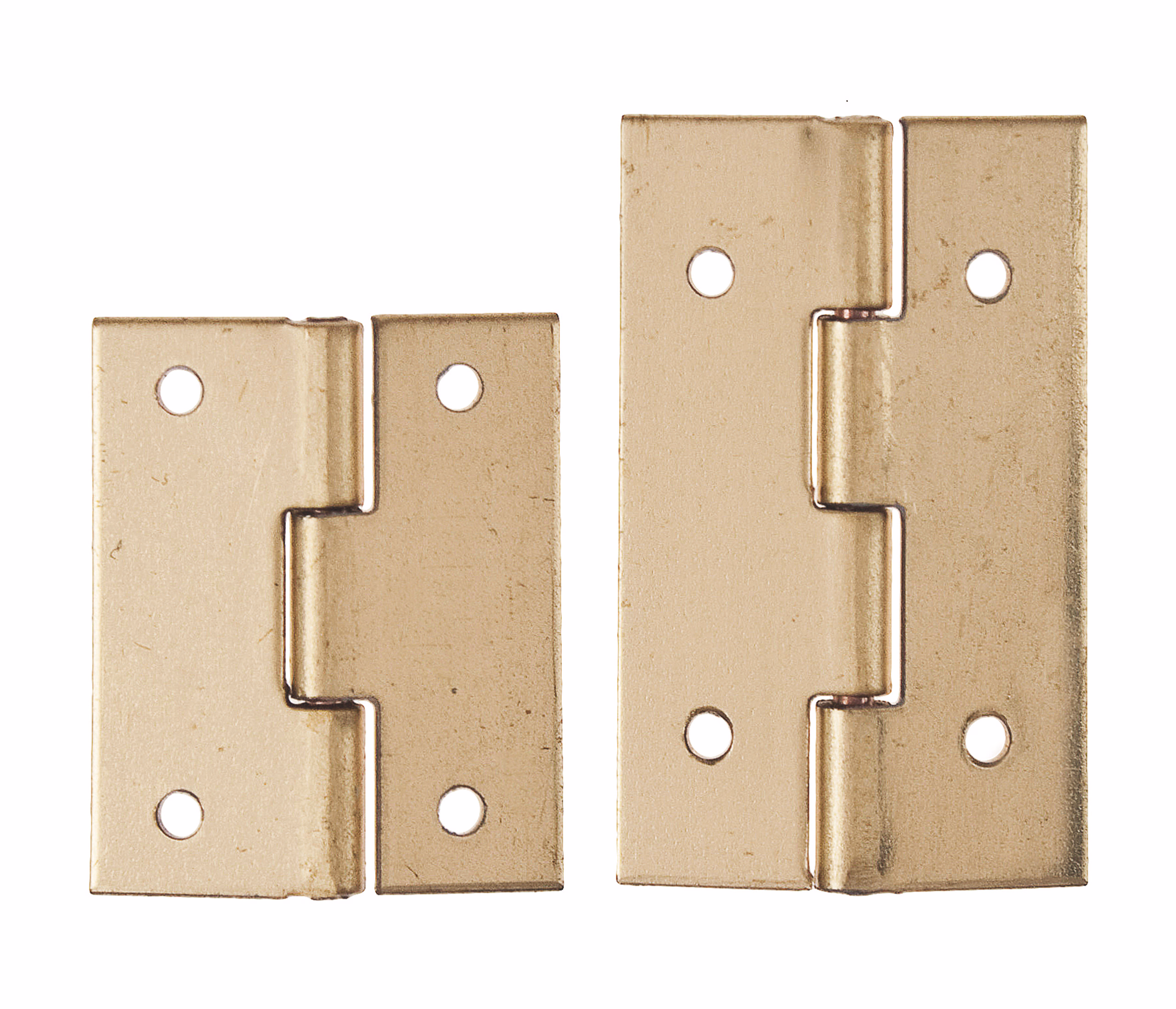 Eisenscharniere, geschlagene Ausführung, vermessingt mit Nagellöchern, Höhe x offene Breite. Maße: ca. 20 x 13 mm, 10 Stück
