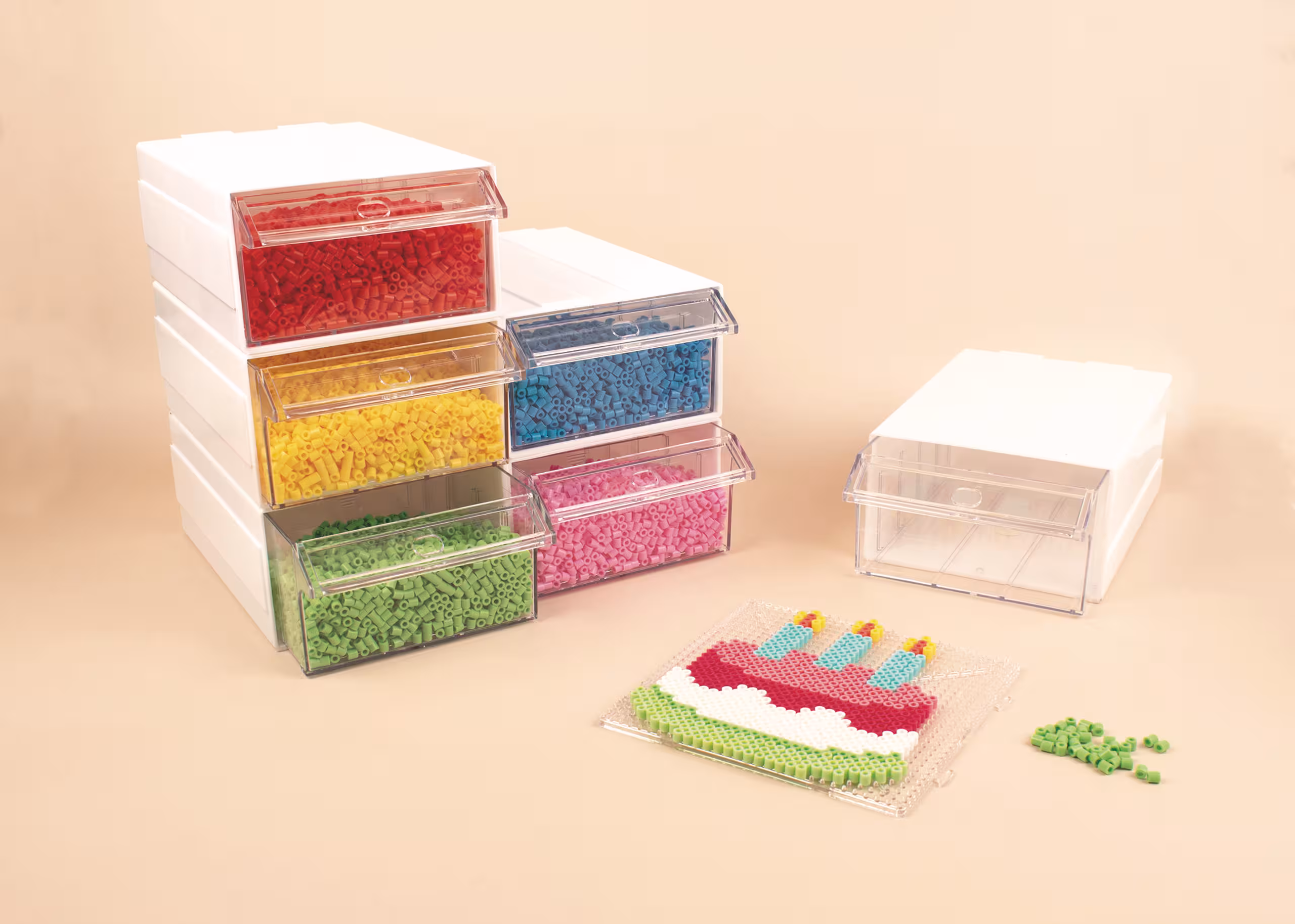 weiße Box mit 2 Schiebeboxen und Griff, mit 8 Trennstegen, 3 Papier-Beschriftungsstreifen und 3 Schutzstreifen, Maße: weiße Box ca. 185 x 135 x 155 mm, Schiebebox c...