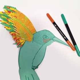 Für dieses Projekt gibt es die Möglichkeit, einer mittleren Differenzierung. Hierbei werden die Vögel mit kleinen Strichen bemalt und mit der Schere und dem Prägestift ausgearbeitet. So entstehen kunterbunte und lebendige Vögel.