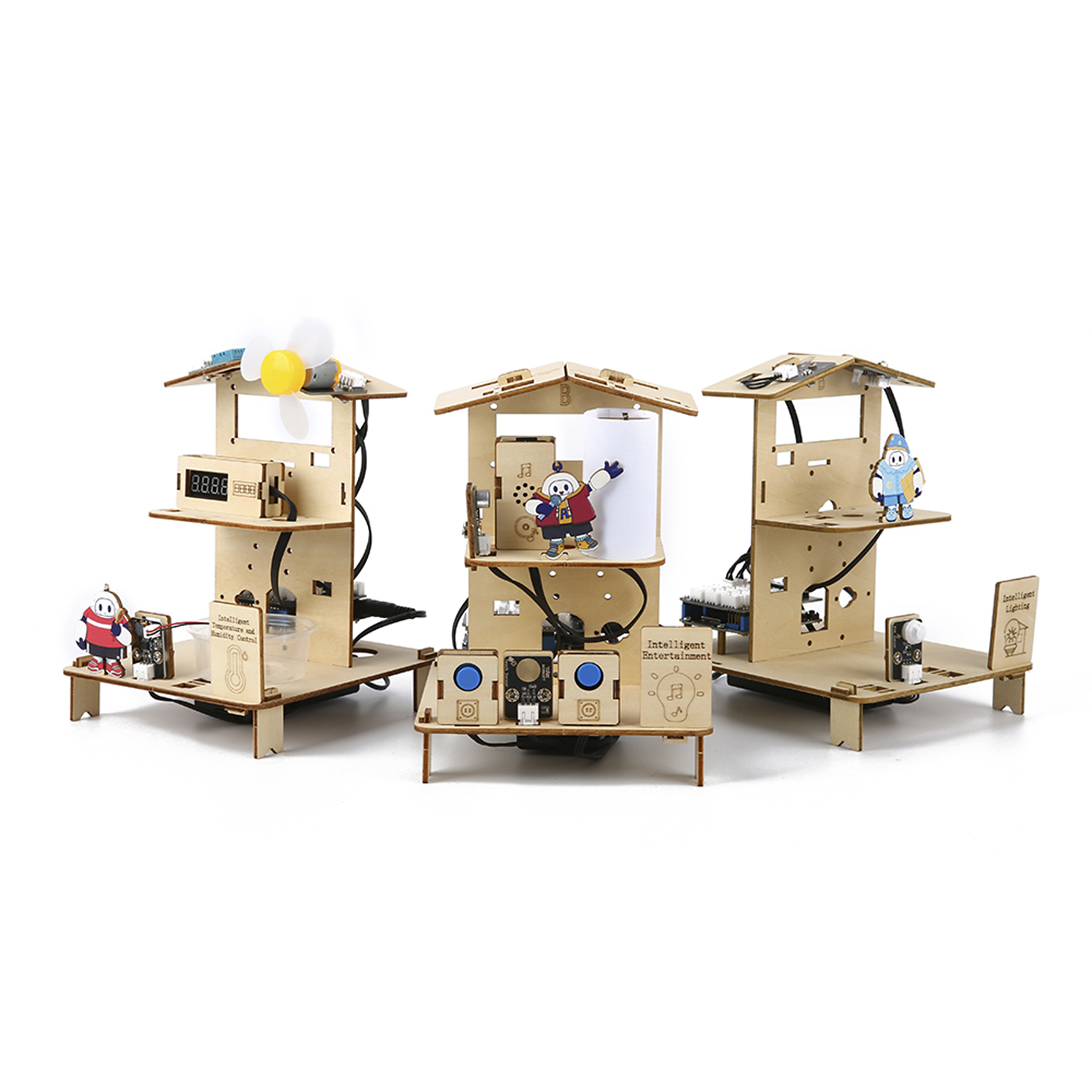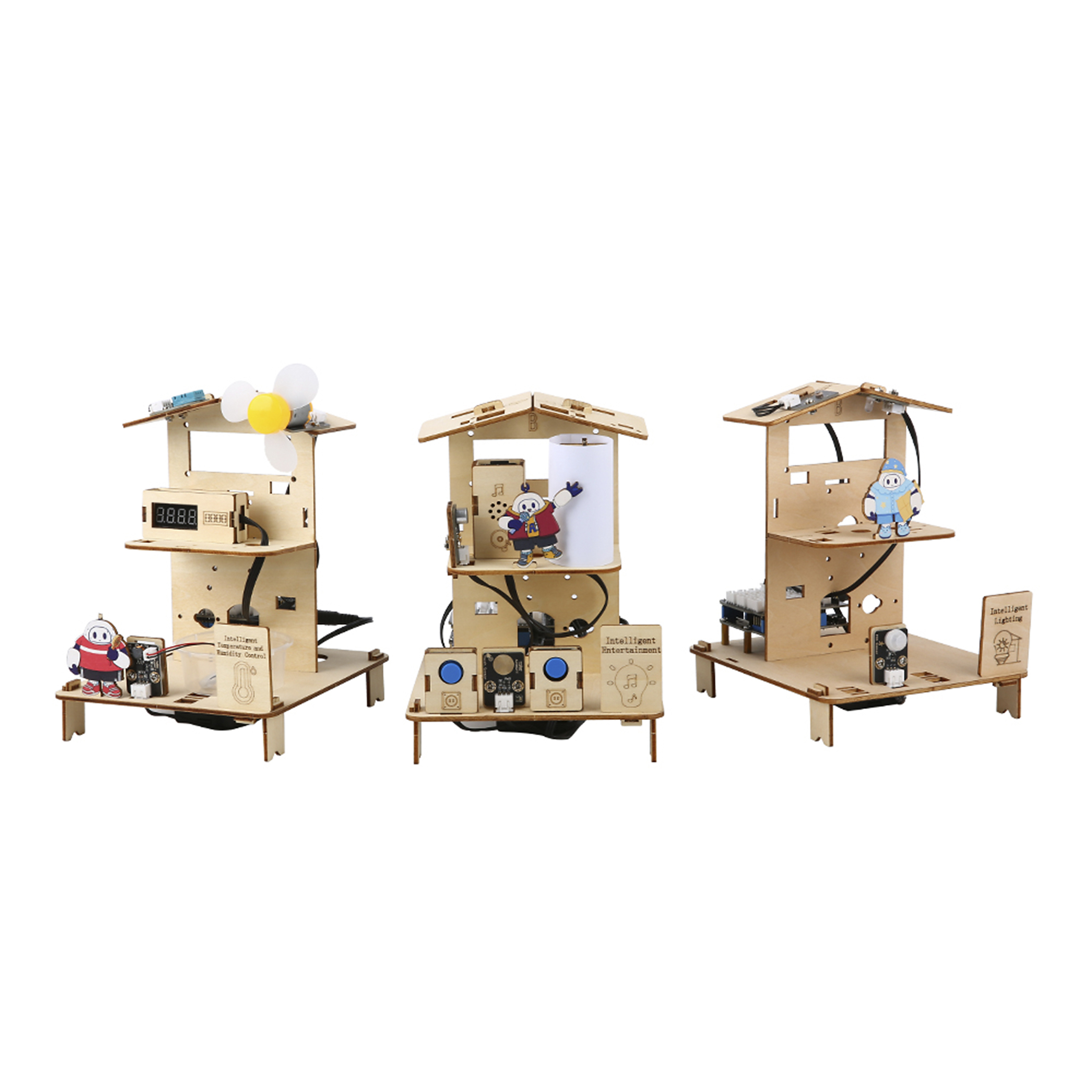 Con este kit, los estudiantes trabajan en tres proyectos prácticos de hogares inteligentes: iluminación inteligente (dormitorio/pasillo), entretenimiento inteligente (sala de entretenimiento) y contro...