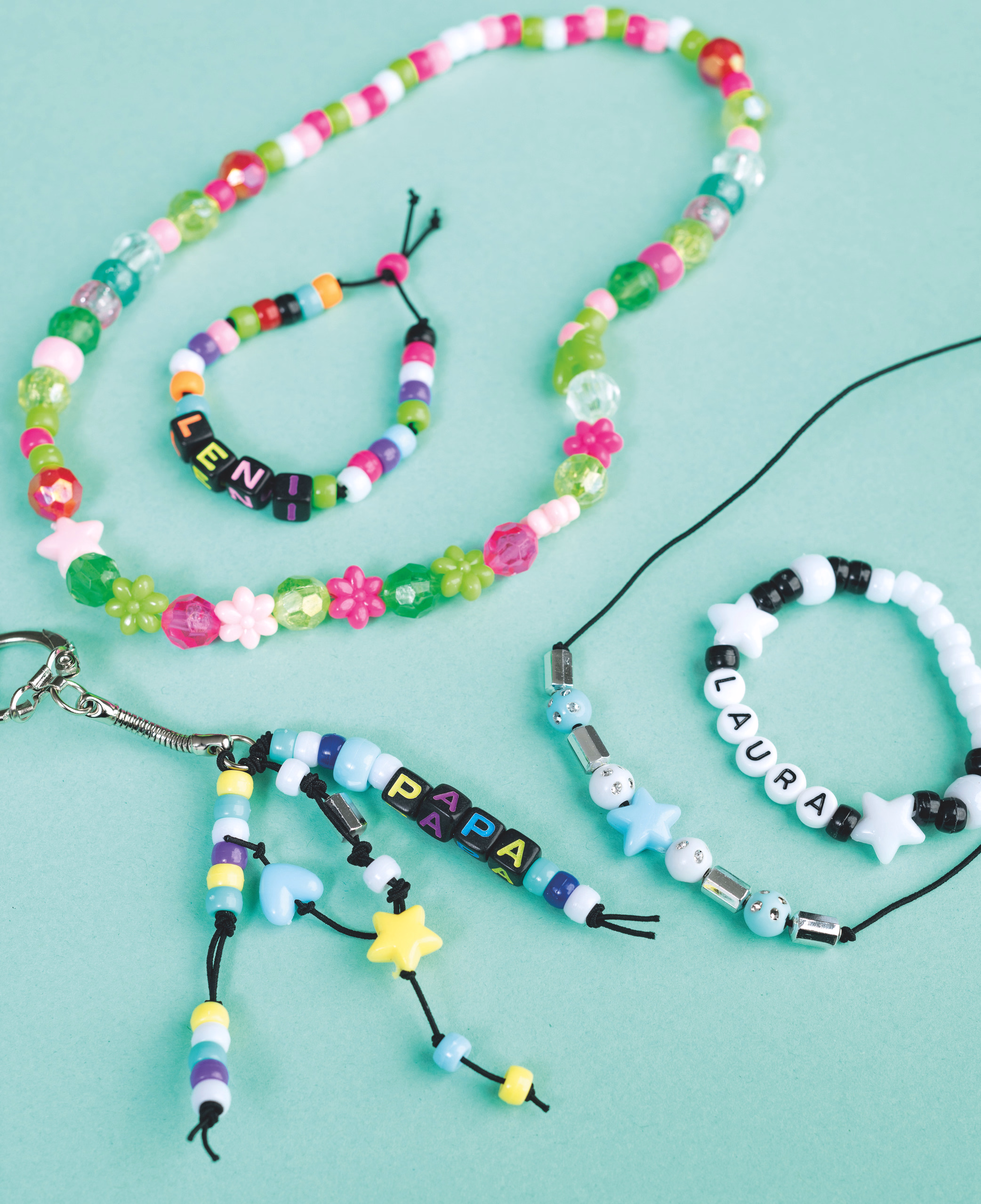 Se entrega en una práctica caja de plástico con 10 compartimentos. Contenido: 1900 cuentas de plástico, varios colores, formas y motivos, dimensiones: 12 mm - 6 mm con orificio de 4 - 1 mm, cordón elástico en blanco y negro 1 x 5 m cada uno, transparente 1 x 3 m de largo, lote con 1900 cuentas.