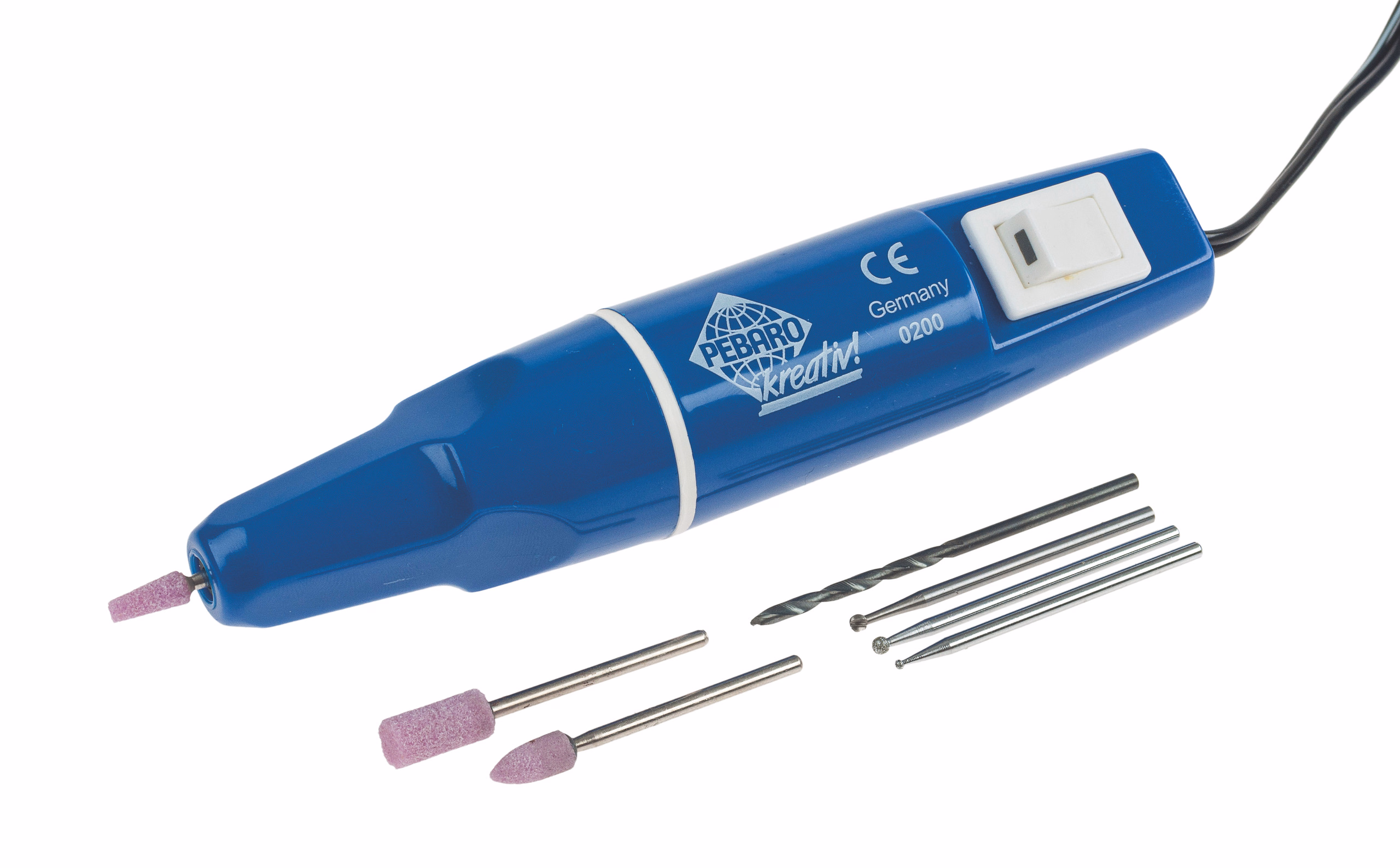 Se suministra junto con una caja de plástico, 1 grabador, 3 puntas para pulir, 2 diamantes para tallar (1 y 2,3 mm), 1 fresadora (2,3 mm) y 1 broca HSS (2,3 mm).
