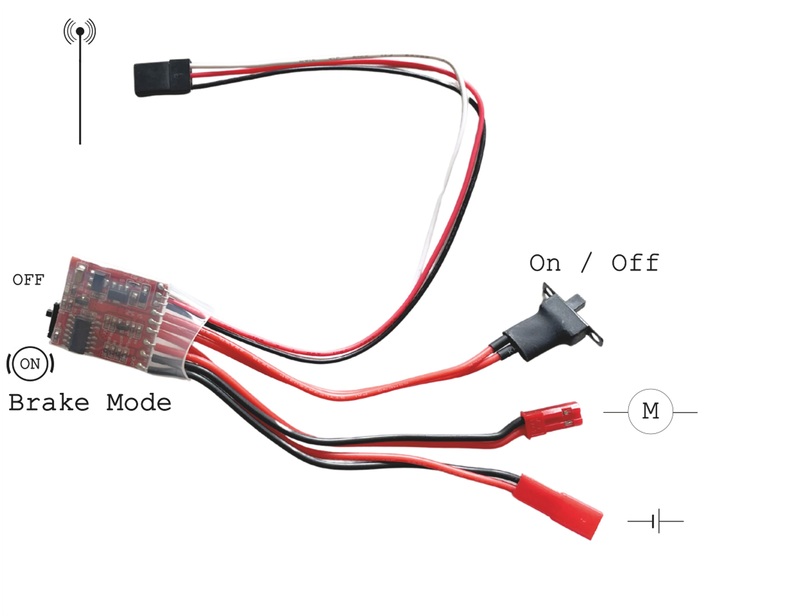 Connexions : connecteur 3 broches (câble de 200 mm) pour le récepteur, DC IN, Motor OUT (câble de 100 mm chacun)