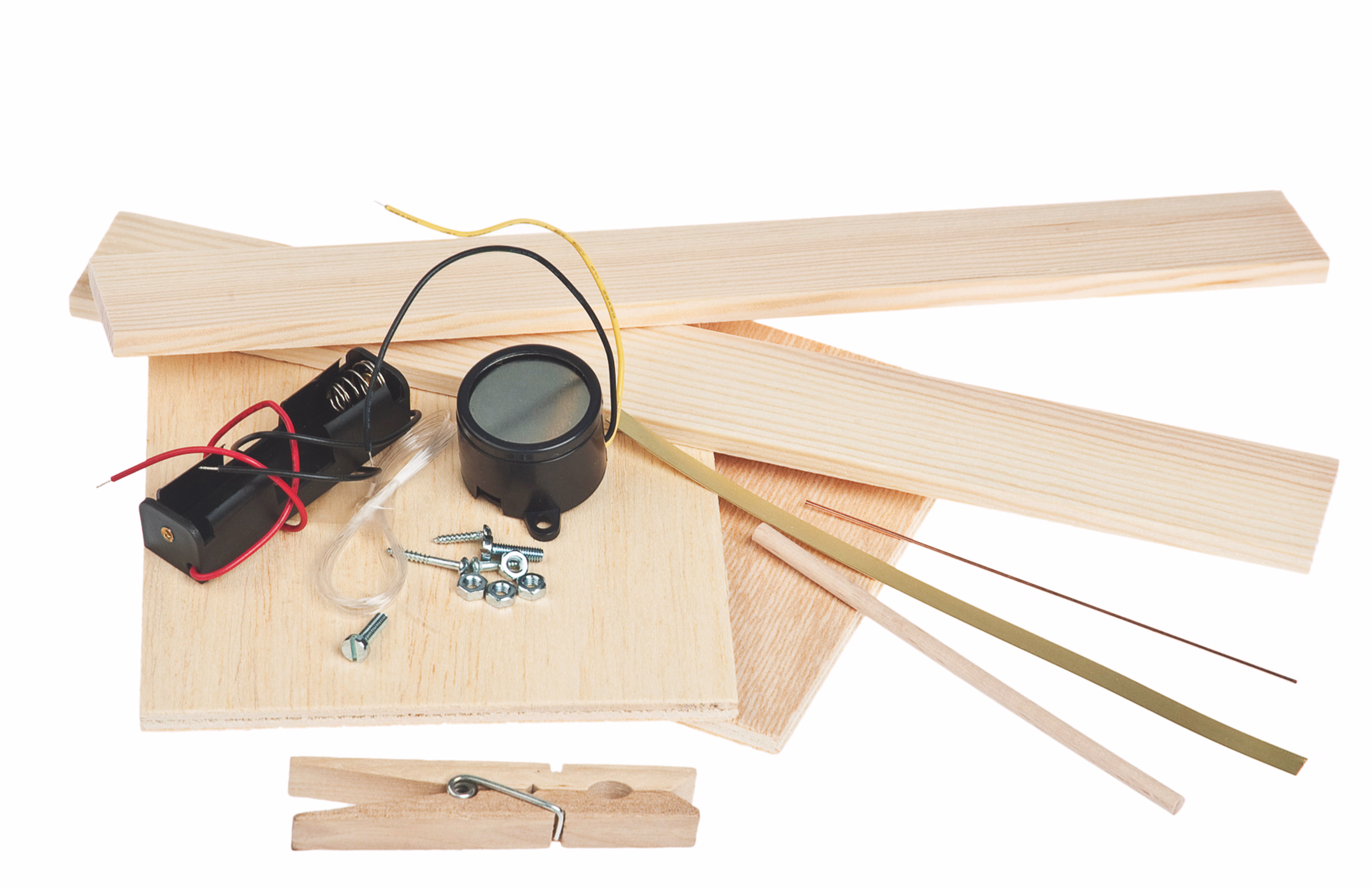Le déclenchement d'un son d'alarme caractéristique est obtenu en retirant de son ancrage une tige ronde reliée à un cordon de trébuchement transparent et en fermant un circuit électrique simple. Livré sans pile mignon 1,5 V (AA). Travaux nécessaires : Percer, scier, souder et coller.