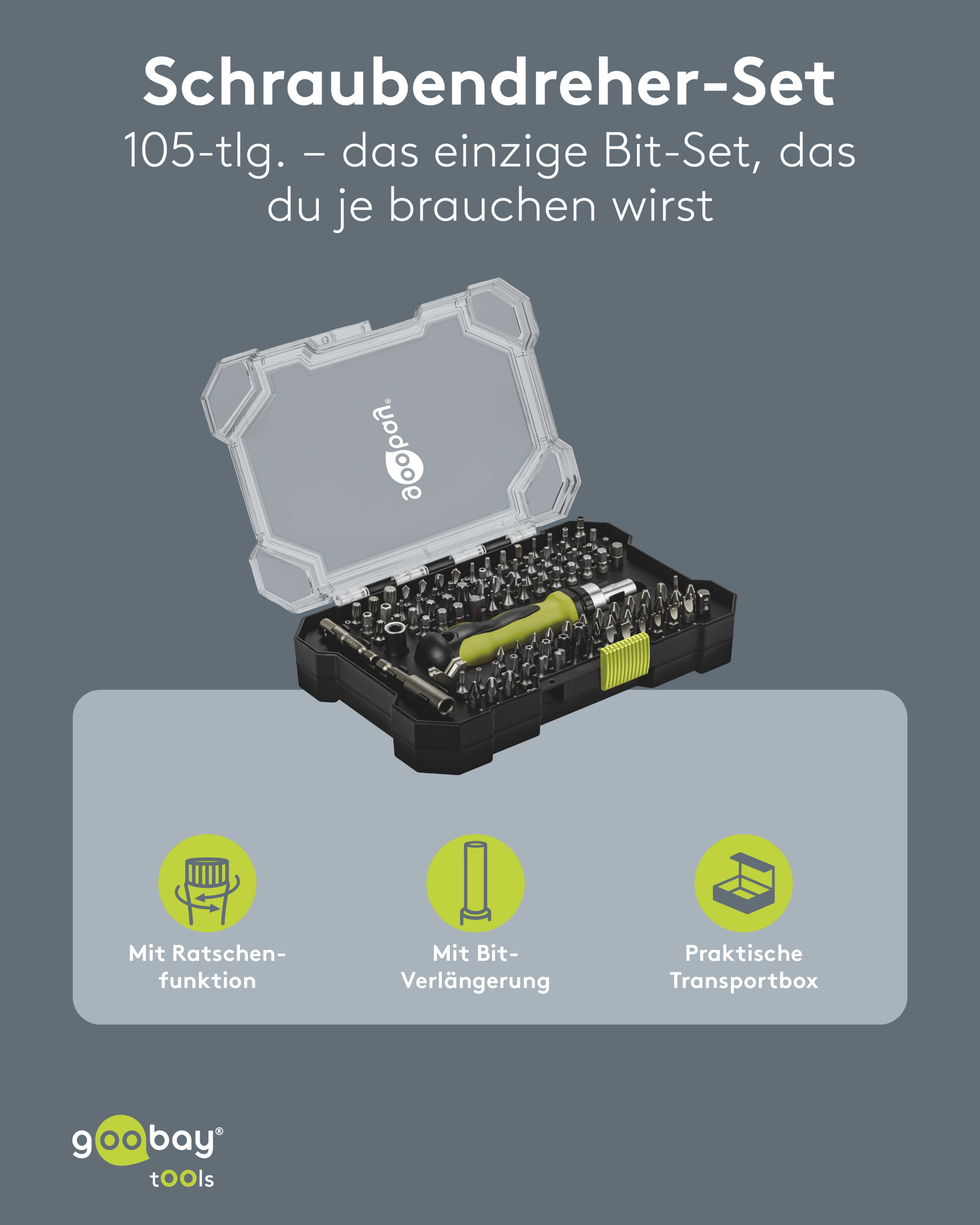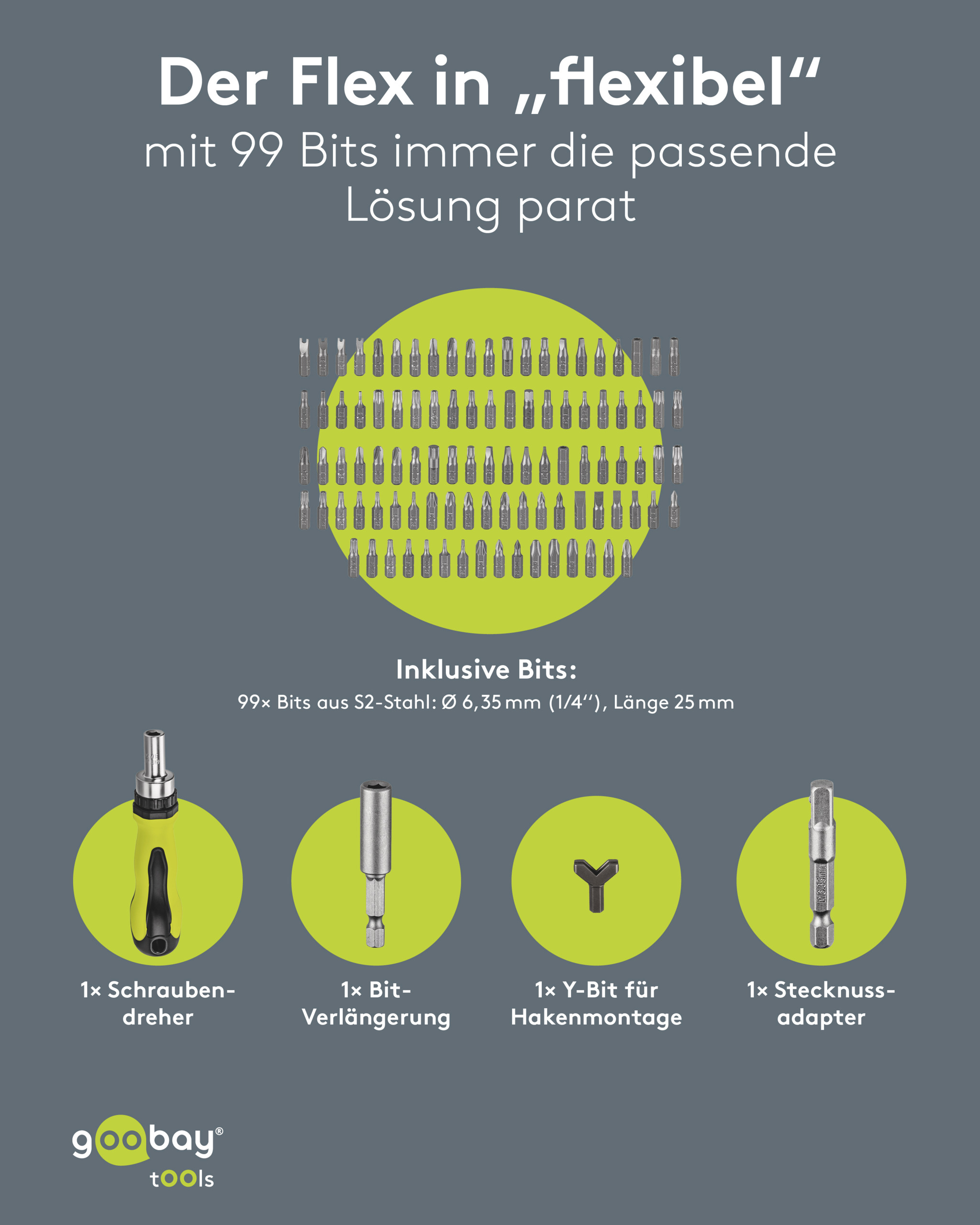Jeu de tournevis avec embouts de 6,35 mm (1/4 "). Tournevis avec manche caoutchouté et fonction cliquet. Comprend également un porte-embouts pour visseuse sans fil, 1 adaptateur pour clé à douille 1/4" (douille hexagonale) et une aide au vissage pour crochet de vissage.