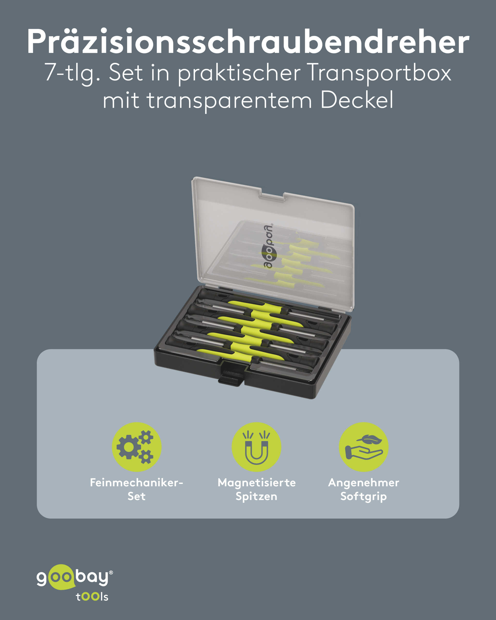 Jeu de tournevis pratique avec pointes magnétisables et design ergonomique. Fabriqué en acier au chrome-vanadium trempé. Avec embout rotatif. Longueur totale des tournevis 165 mm. Livré dans une boîte solide avec couvercle transparent.