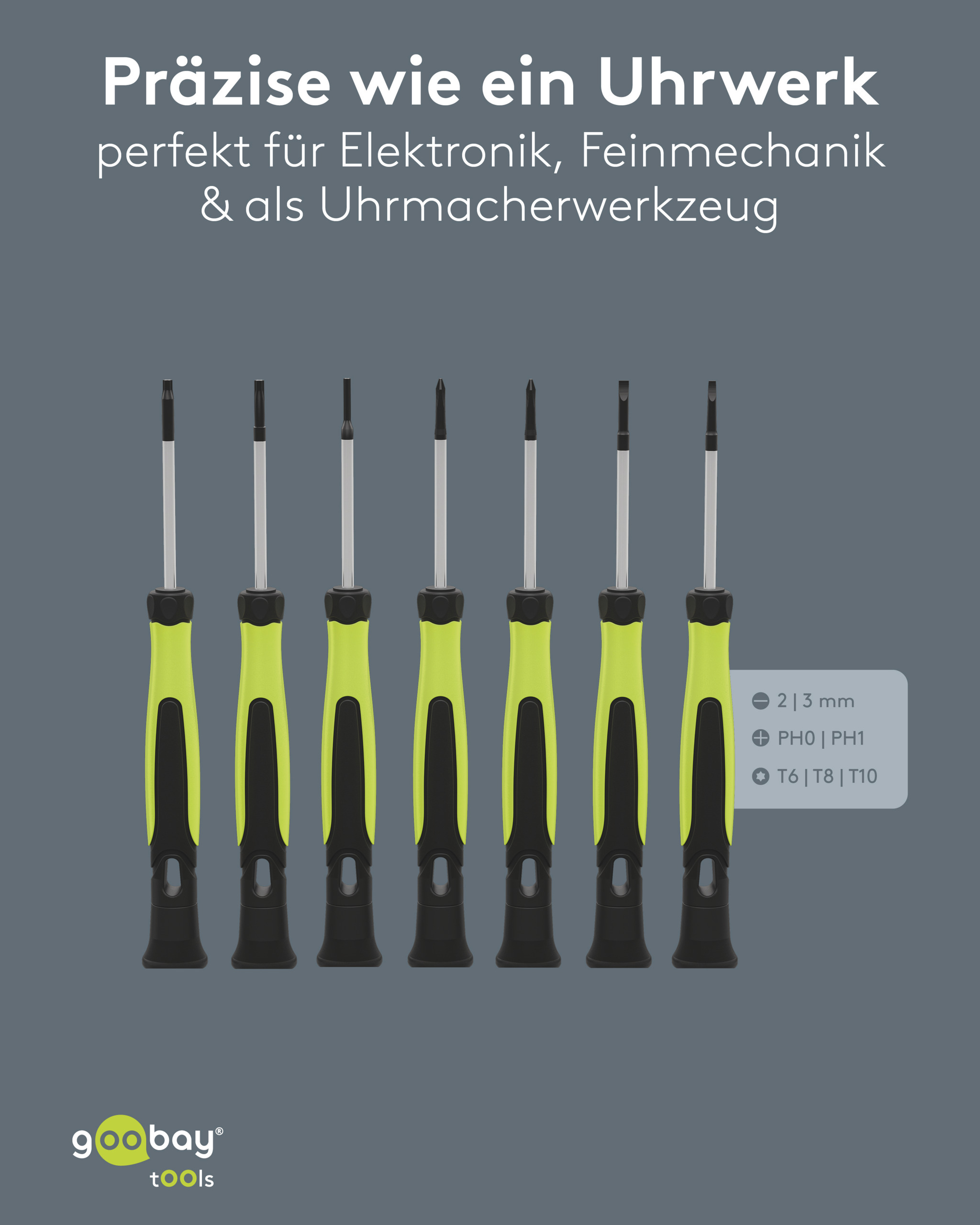 1x tournevis à fente 2 mm et 3 mm, cruciforme PH0 et PH1, six pans creux T6, T8, T10, boîte de rangement.