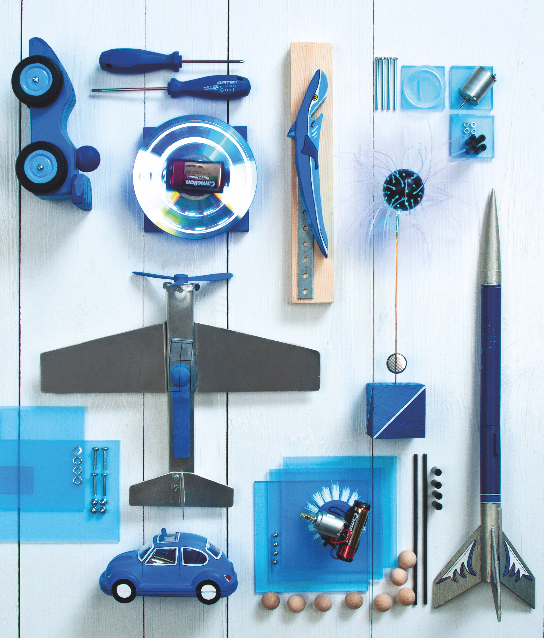 Avion en métal en modèle réduit avec hélice à énergie solaire. Tôlerie en aluminium, pied en contreplaqué et l'hélice est actionnée par une cellule solaire 0,5V/200mA. Circuit électrique simple possible sans soudure. Travaux nécessaires : Tracer, scier, couper, percer, plier, coller et assembler.