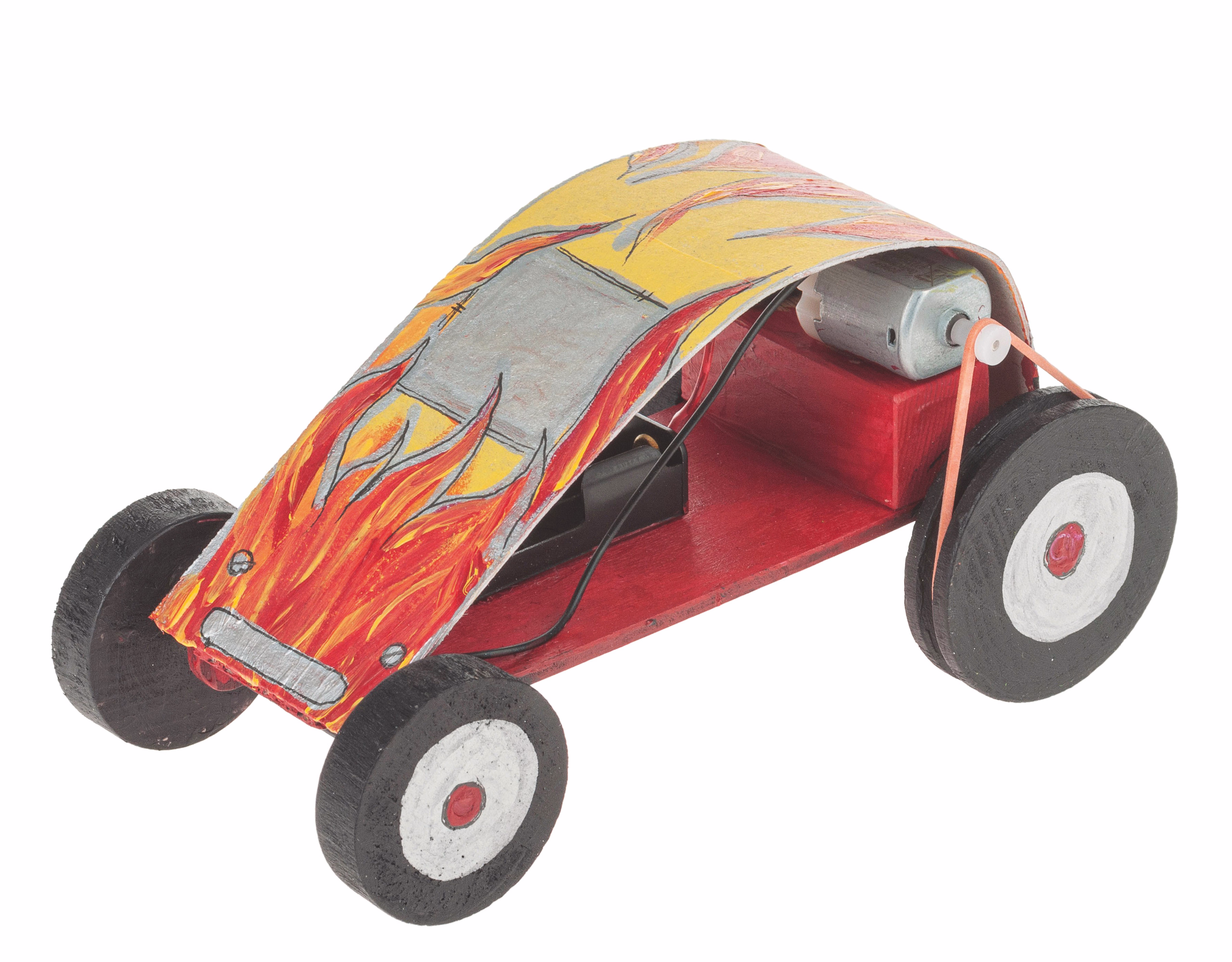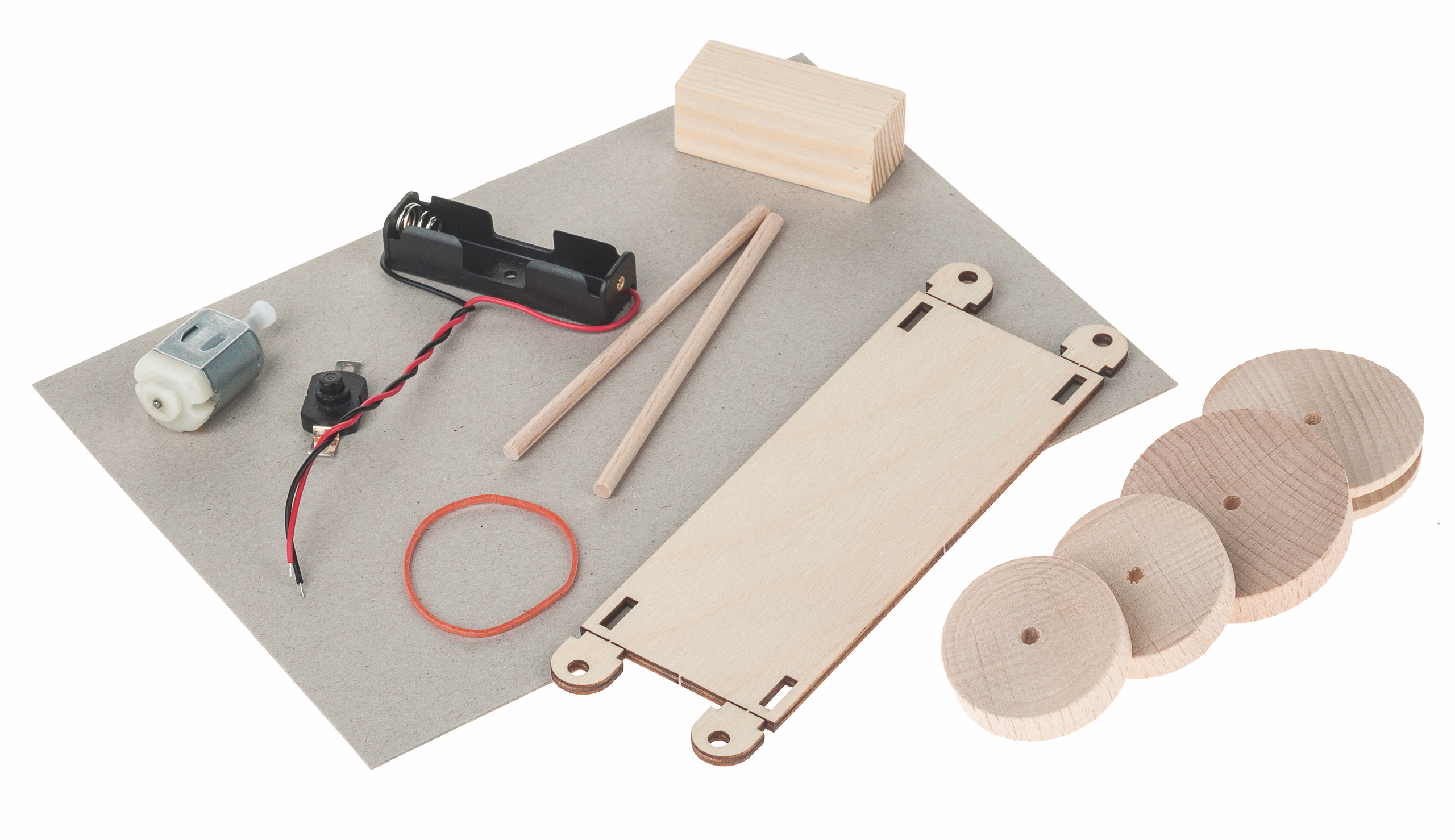 Montage simple et rapide du véhicule électrique possible dans la salle de classe. Entraînement par moteur électrique et courroie. Circuit électrique simple avec interrupteur, également possible sans soudure. La conception de la carrosserie est libre. Livré sans pile mignon 1,5V (AA).