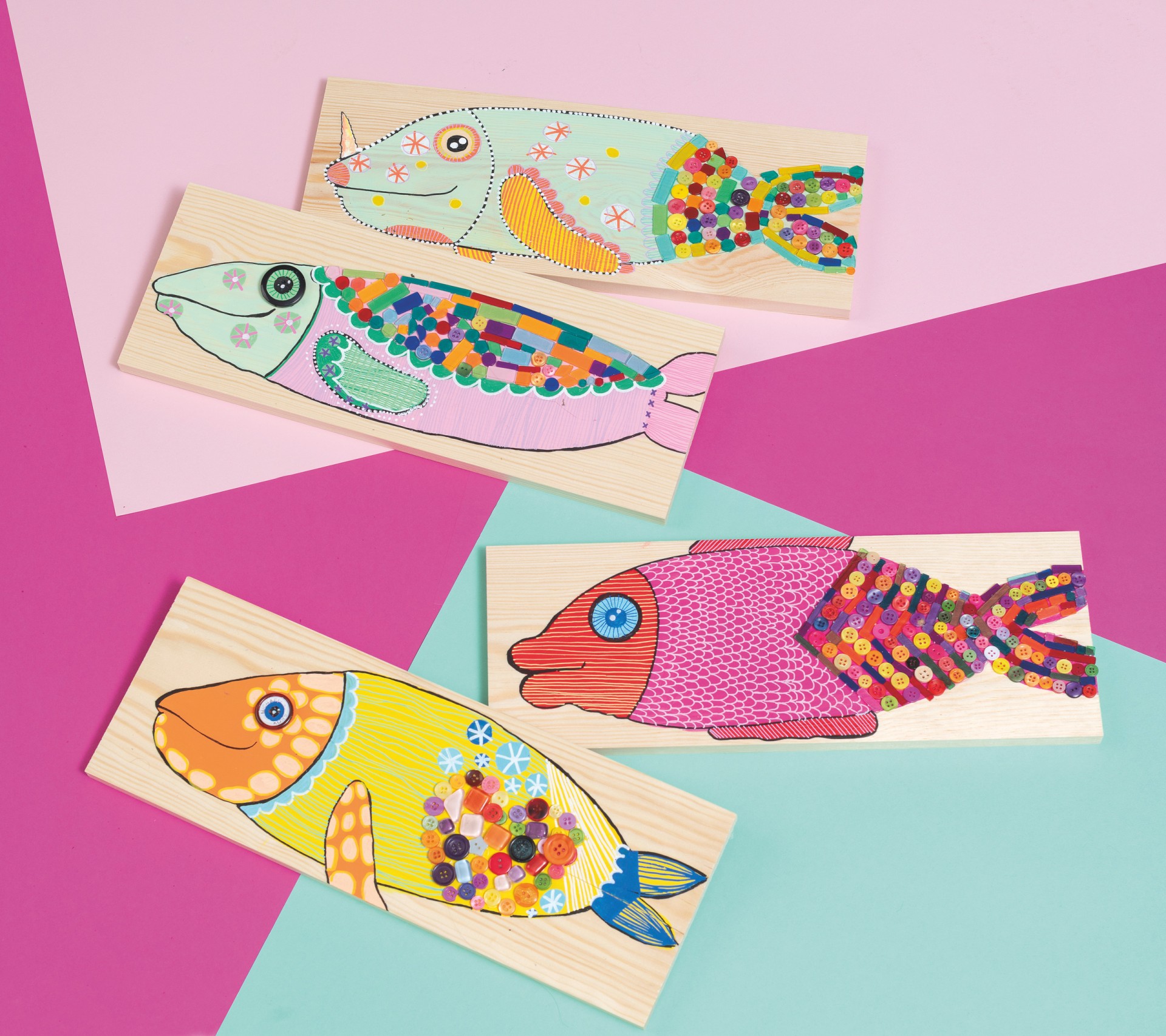 Décorer avec des tesselles de mosaïque et des boutons.