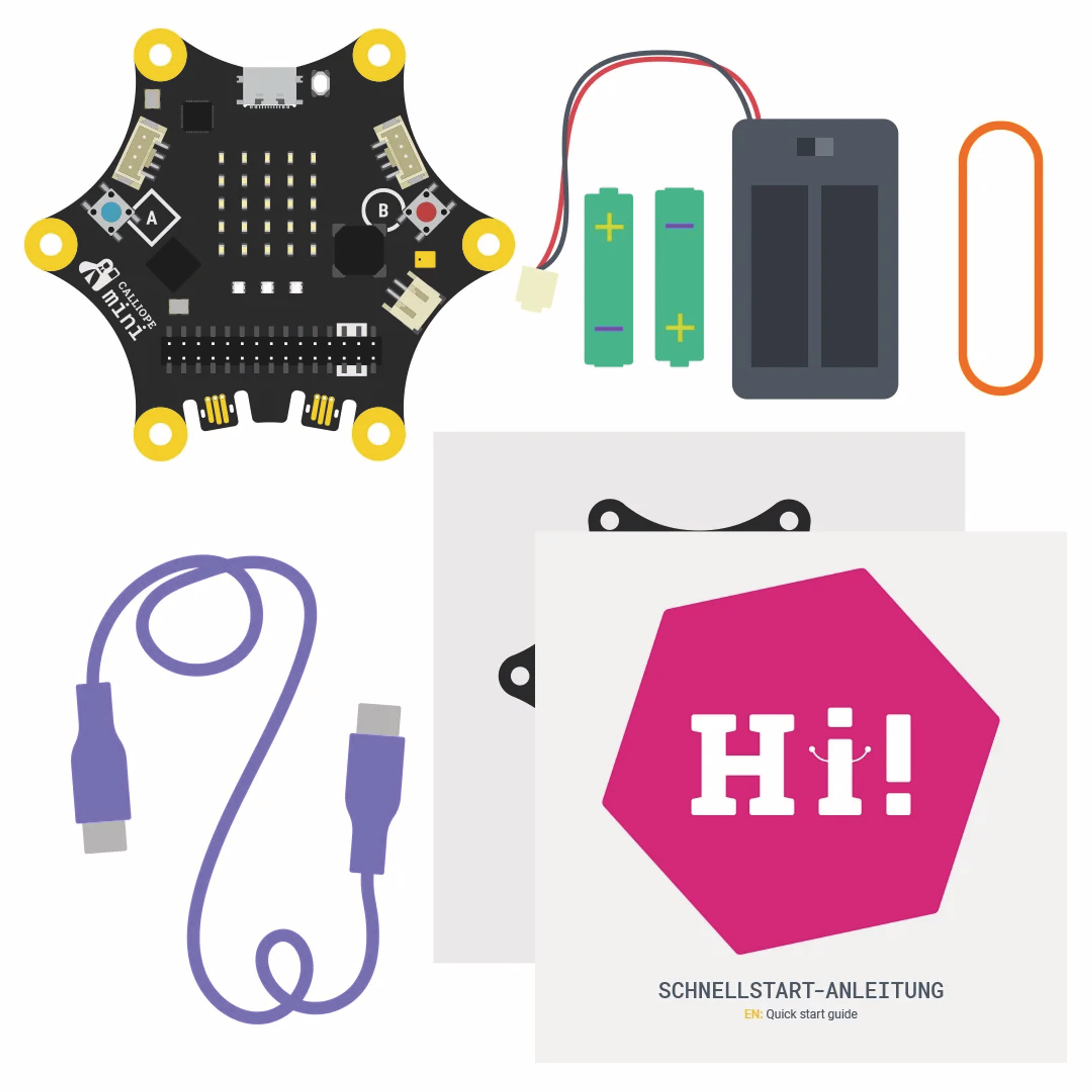 Contenu : Calliope mini, support de piles avec piles (2 micro AAA), câble USB, autocollant, instructions avec exemples de programmation en allemand et en anglais, 1 kit