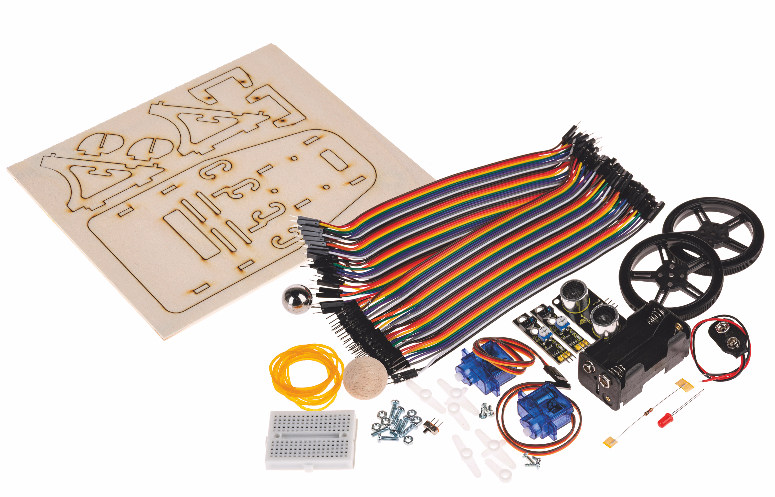 Contenu : 1 plaque de contreplaqué découpée au laser, 2 servomoteurs 360°, 2 roues, 2 capteurs de suivi de ligne, 1 capteur à ultrasons, 1 mini-planche à dessin, 1 mini-interrupteur à coulisse, 1 bille en acier de 18 mm, 1 bille en bois de 25 mm (comme roue avant), 1 support de piles 4x AA, 1 clip pour piles, câbles de raccordement, 1 LED, 1 résistance série de 1 kOhm et matériel de fixation.