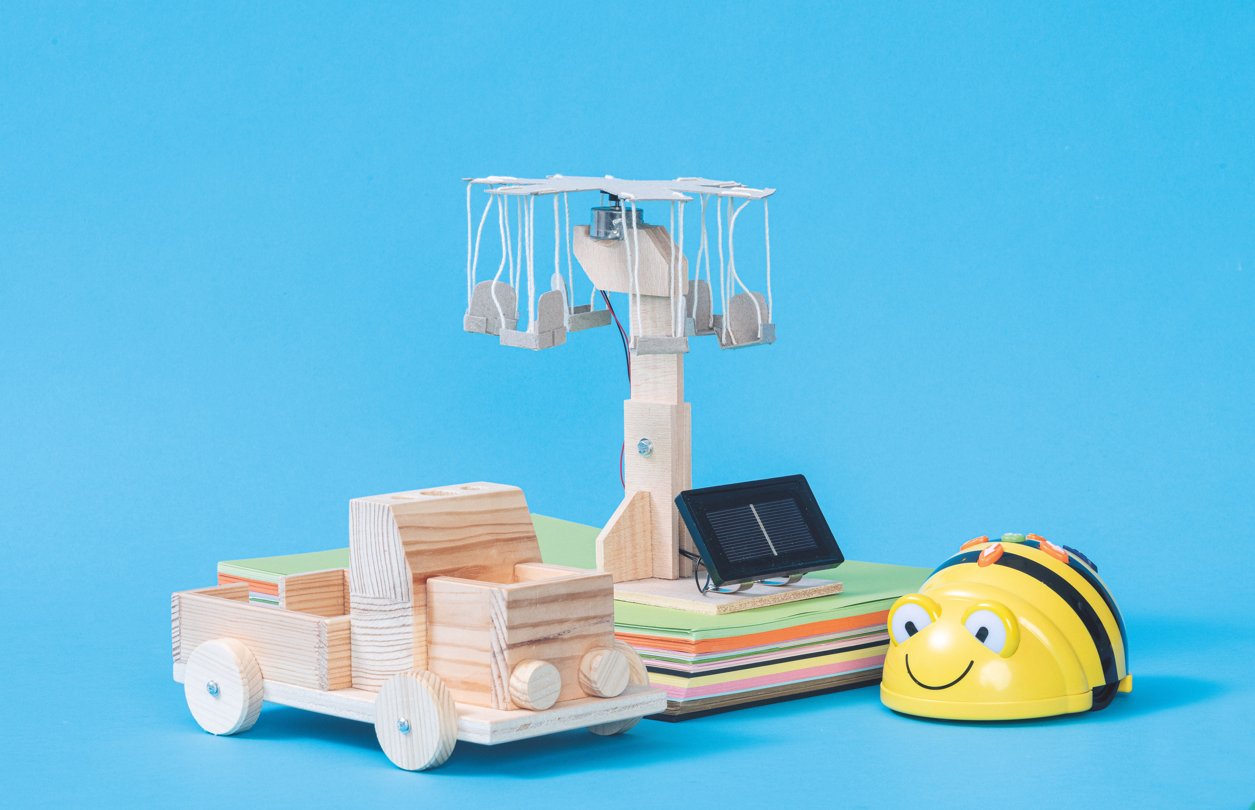 Carrousel à énergie solaire avec 6 sièges. Mélange de matériaux en carton et contreplaqué. Emballage d'usine avec moteur solaire RF 300 et une cellule solaire moulée 0,5 V.