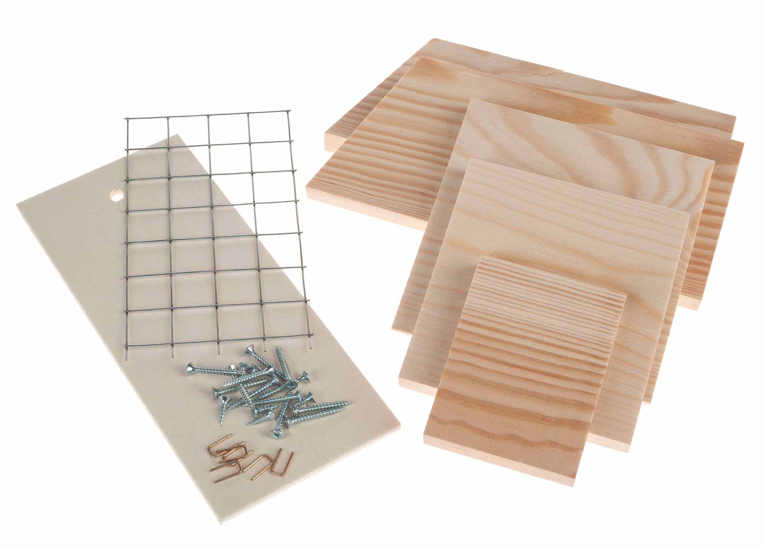 Un kit de construction pour les plus grands parmi les plus petits. Eléments préfabriqués en bois tendre massif naturel pour une seule maison d'insectes avec grille. Peut être rempli de cônes, d'écorce, de laine de bois et d'autres matériaux naturels. Livré sans contenu. Travaux nécessaires : Traçage, collage et montage. Dimensions : env. 110 x 110 x 210 mm, 1 pièce