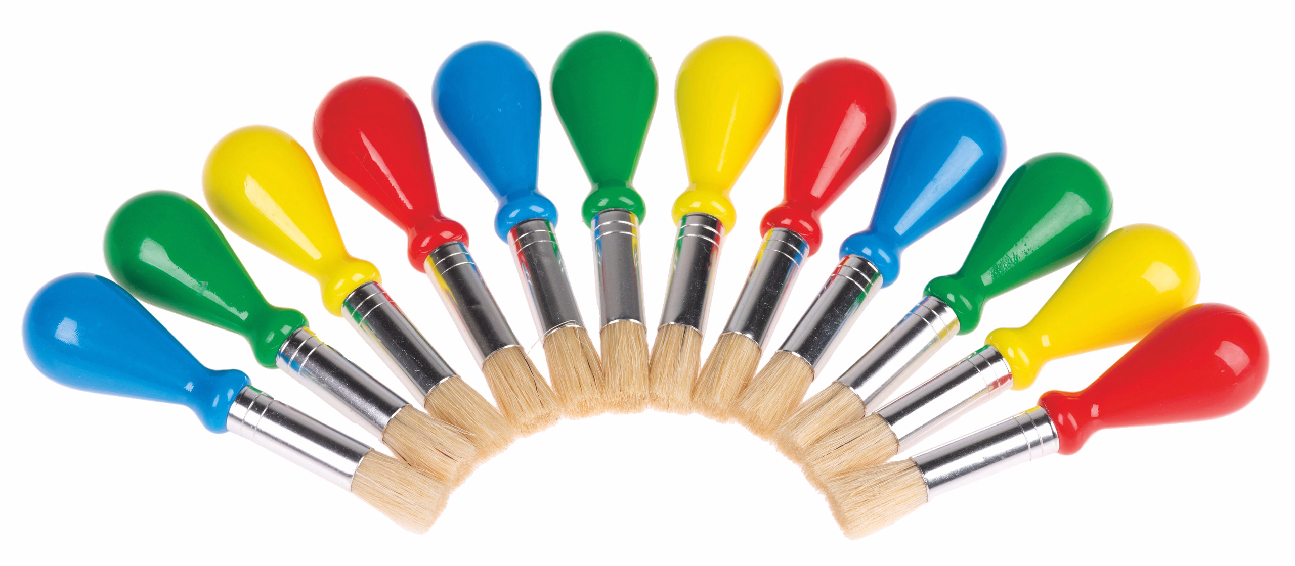Pinceaux en soie épaisse avec grande poignée en plastique en forme de poire et virole métallique, 4 couleurs assorties. Dimensions : env. 105 mm de long, set de 12 pièces