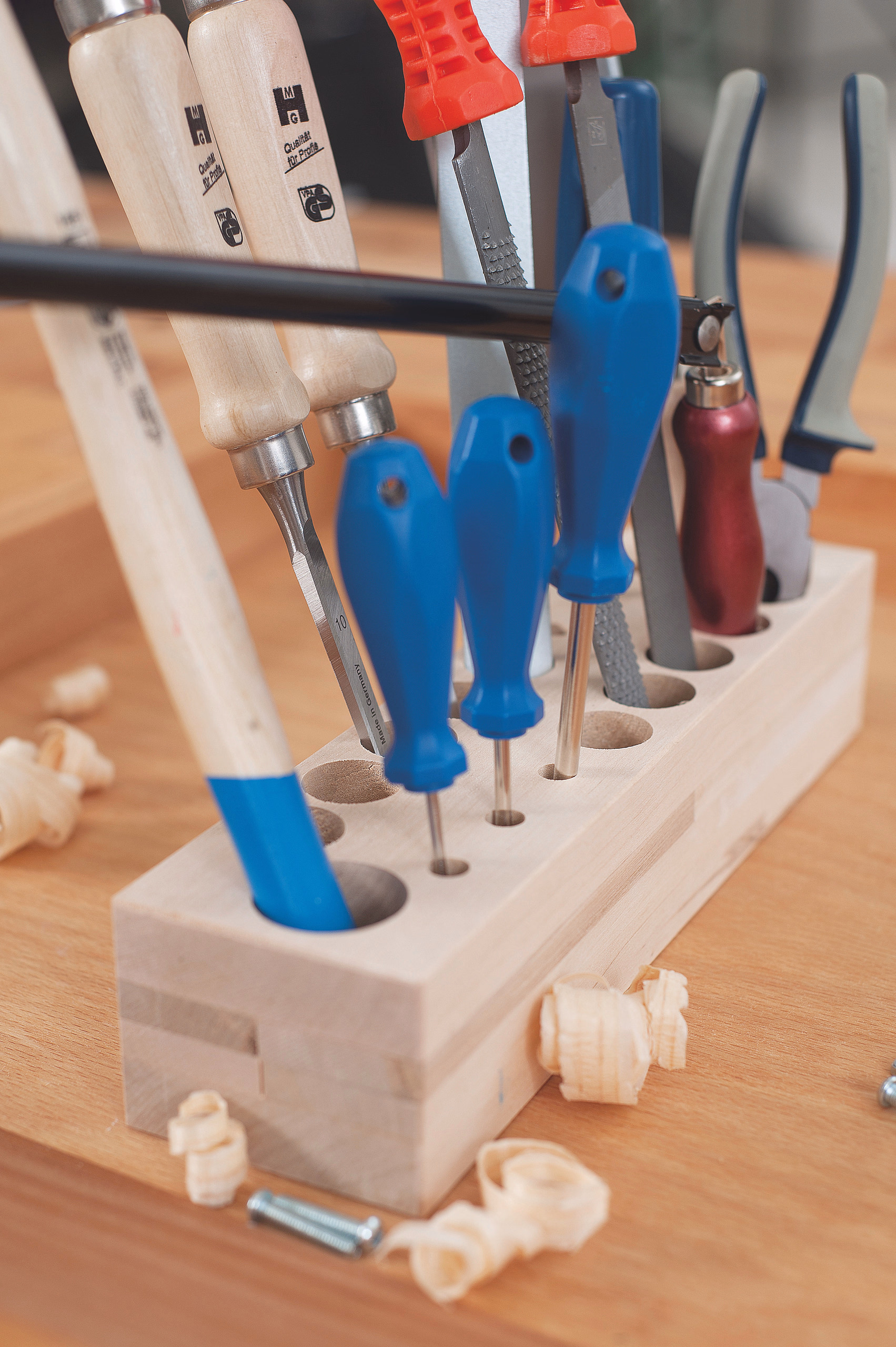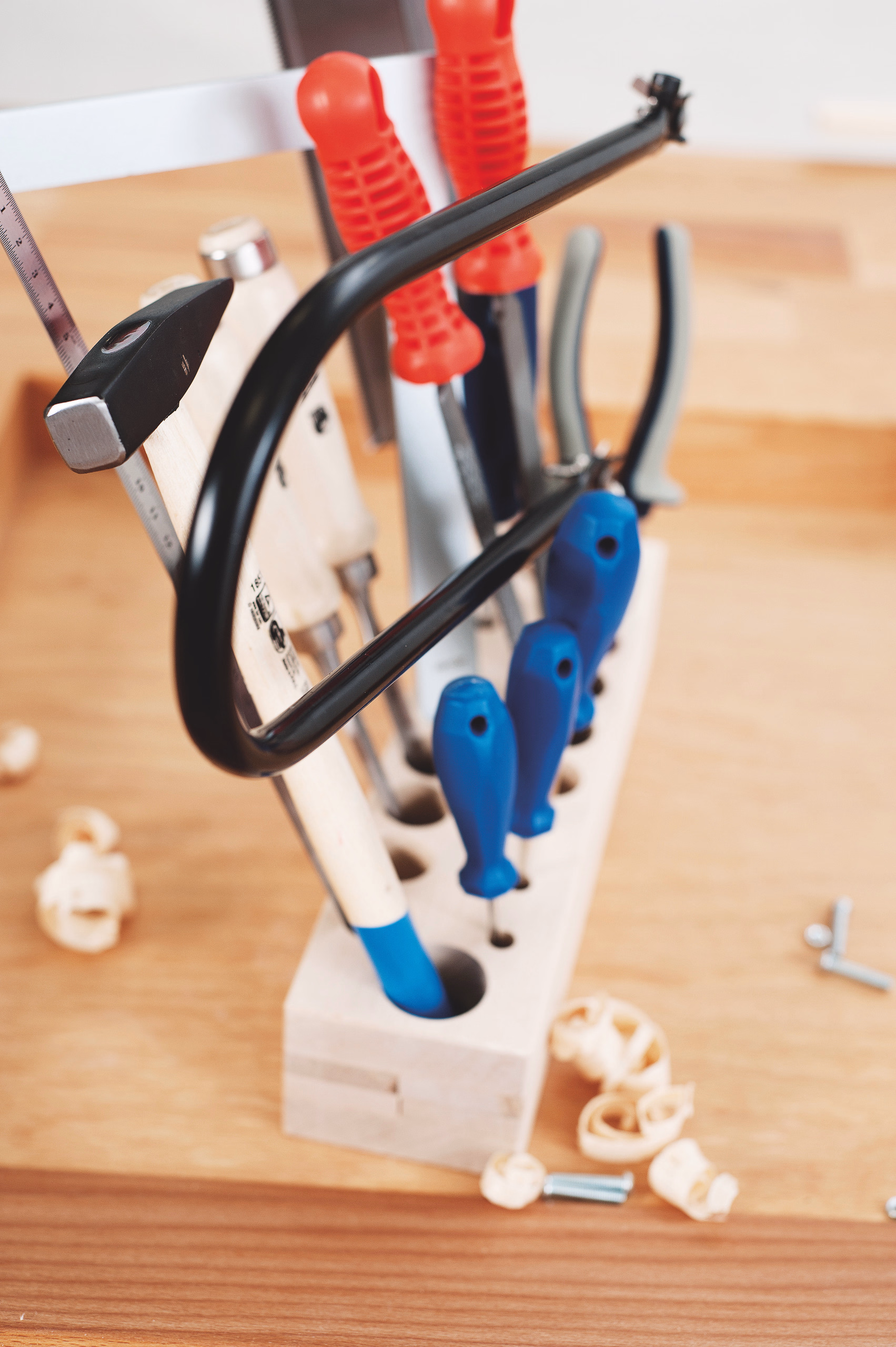 Complètement équipé avec les outils les plus importants pour le travail du bois. Le jeu d'outils se compose de 15 outils et d'un bloc d'outils.
