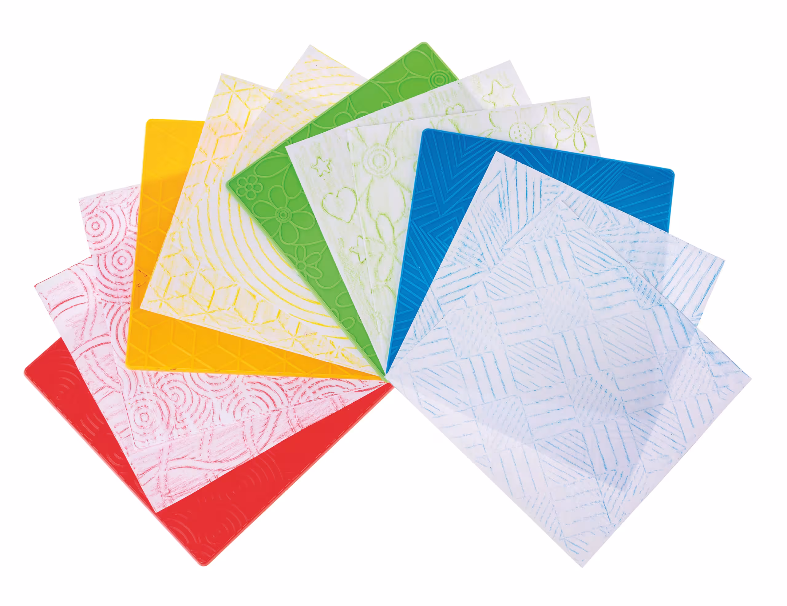 8 motifs différents pour gaufrer la pâte à modeler ou tamponner avec de la peinture, différentes structures, plastique, couleurs assorties, motif des deux côtés, dimensions : environ 150 x 150 x 3 mm, lot de 4