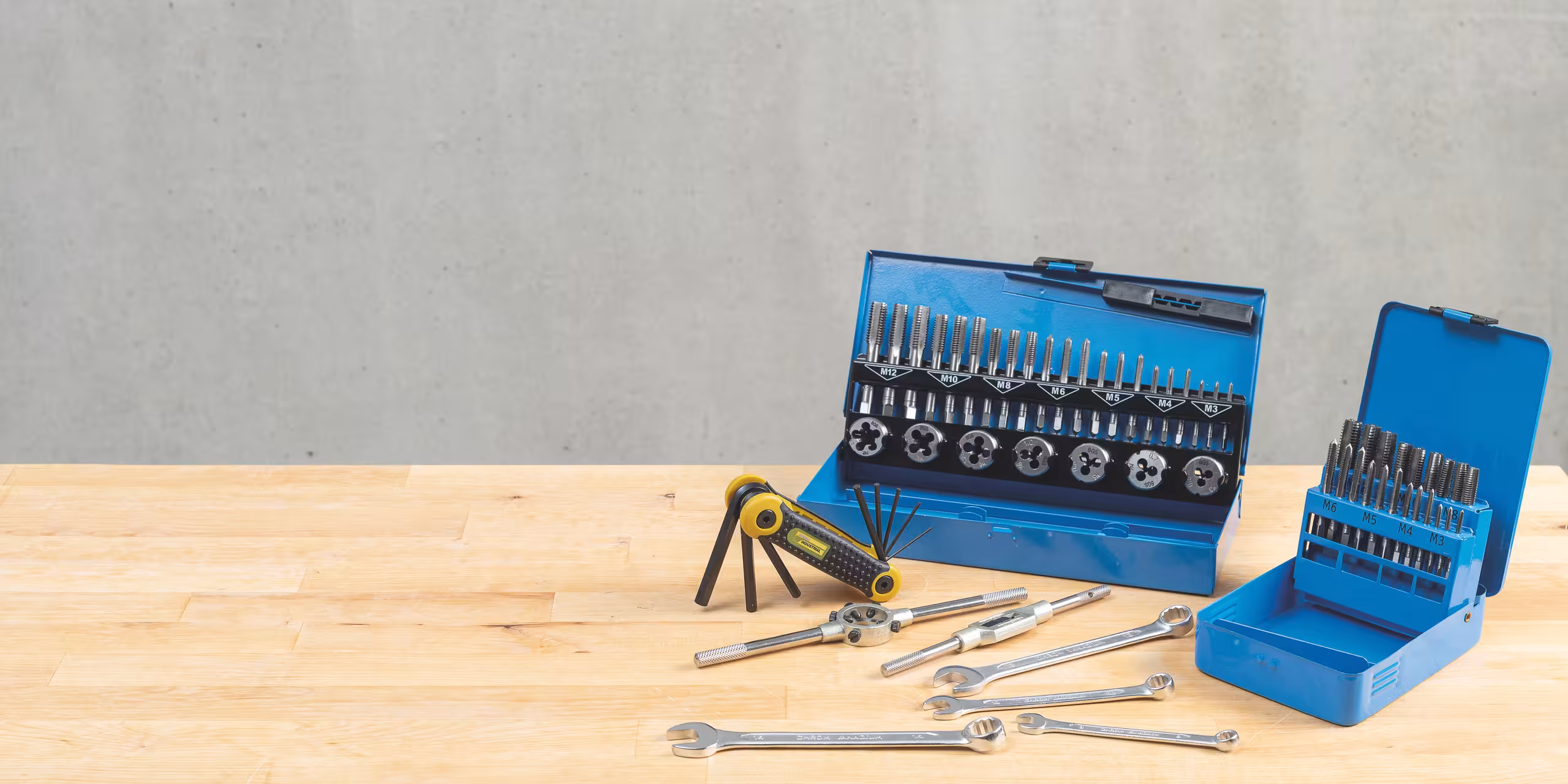 Jeu de tarauds à main selon DIN 352, dans une cassette métallique pratique.