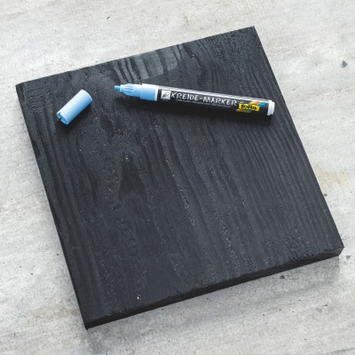 Lisser la planche de bois avec du papier de verre, peindre entièrement la planche en noir (recto et verso), laisser sécher l'application de peinture. Pour la suspension, visser deux vis à anneau dans le bord supérieur de la planche de bois. Avant de les visser, percer un trou avec une perceuse à main. Il est également possible de percer deux trous dans la planche pour la suspendre (perceuse).