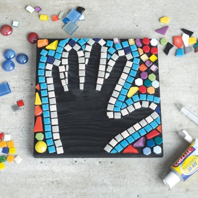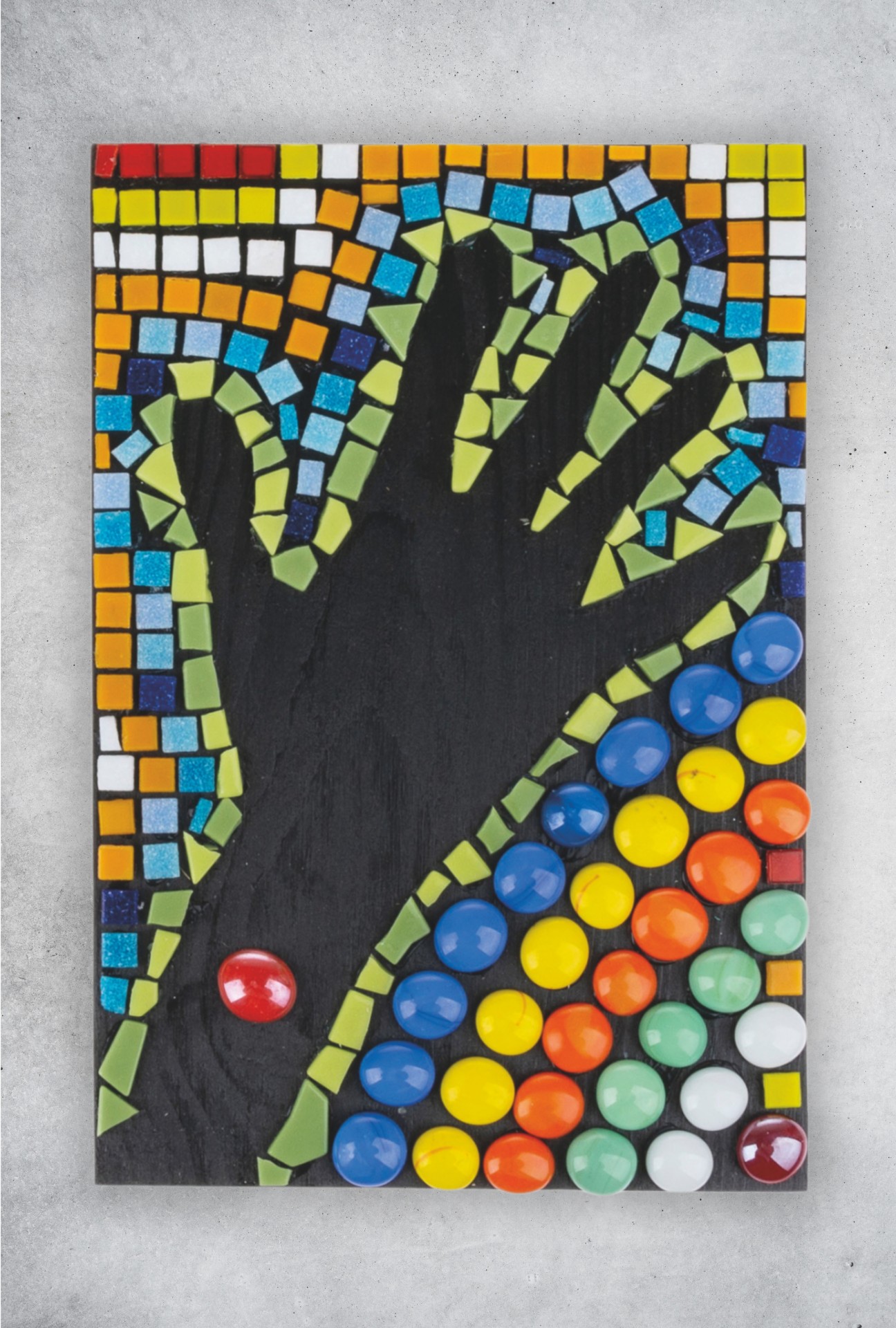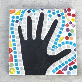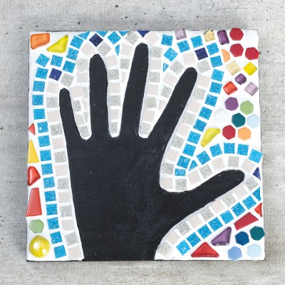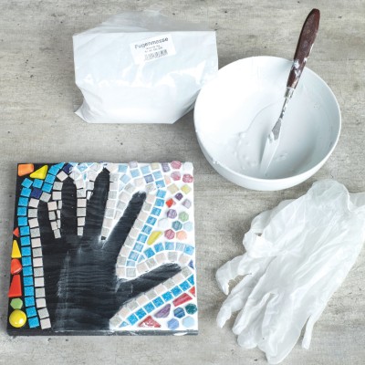 Coller des tesselles de mosaïque sur la surface libre autour de la main (forme négative), laisser la paume de la main libre. Après le séchage de la colle, enlever le marquage à la craie de la main avec un chiffon humide.